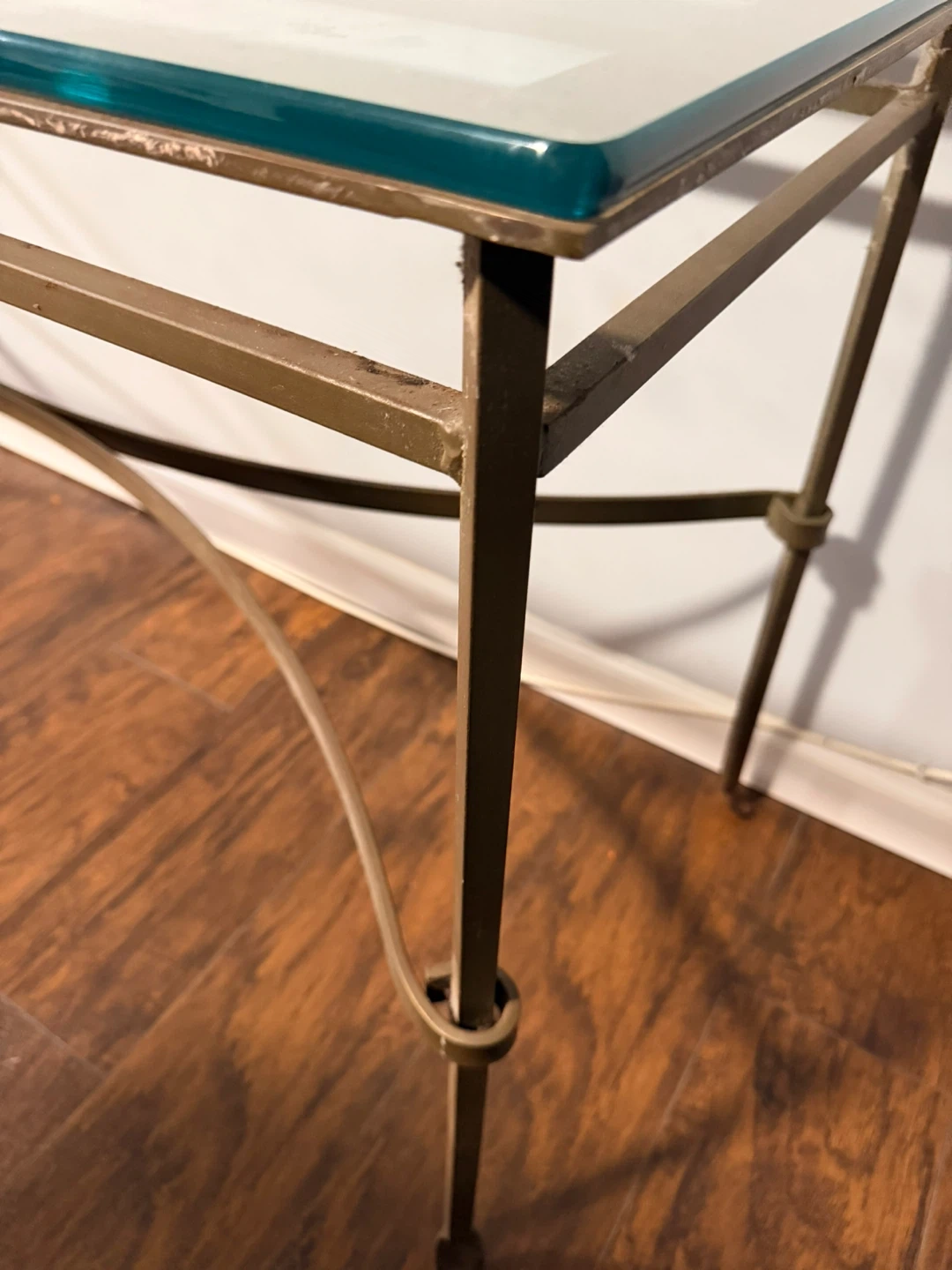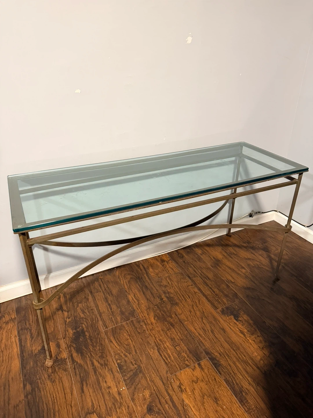 Selling a glass top console table with an iron frame. It's in good condition and would look great in an entryway or living room. The frame has a bronze-like color with some rust. Top measurements are 20x54 inches.