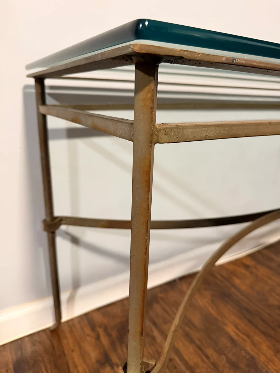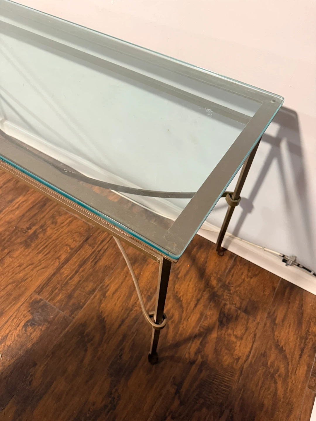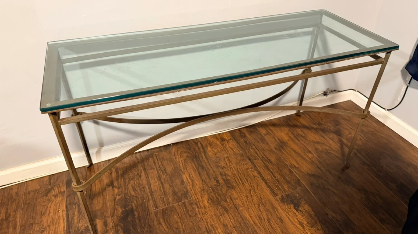 Selling a glass top console table with an iron frame. It's in good condition and would look great in an entryway or living room. The frame has a bronze-like color with some rust. Top measurements are 20x54 inches.