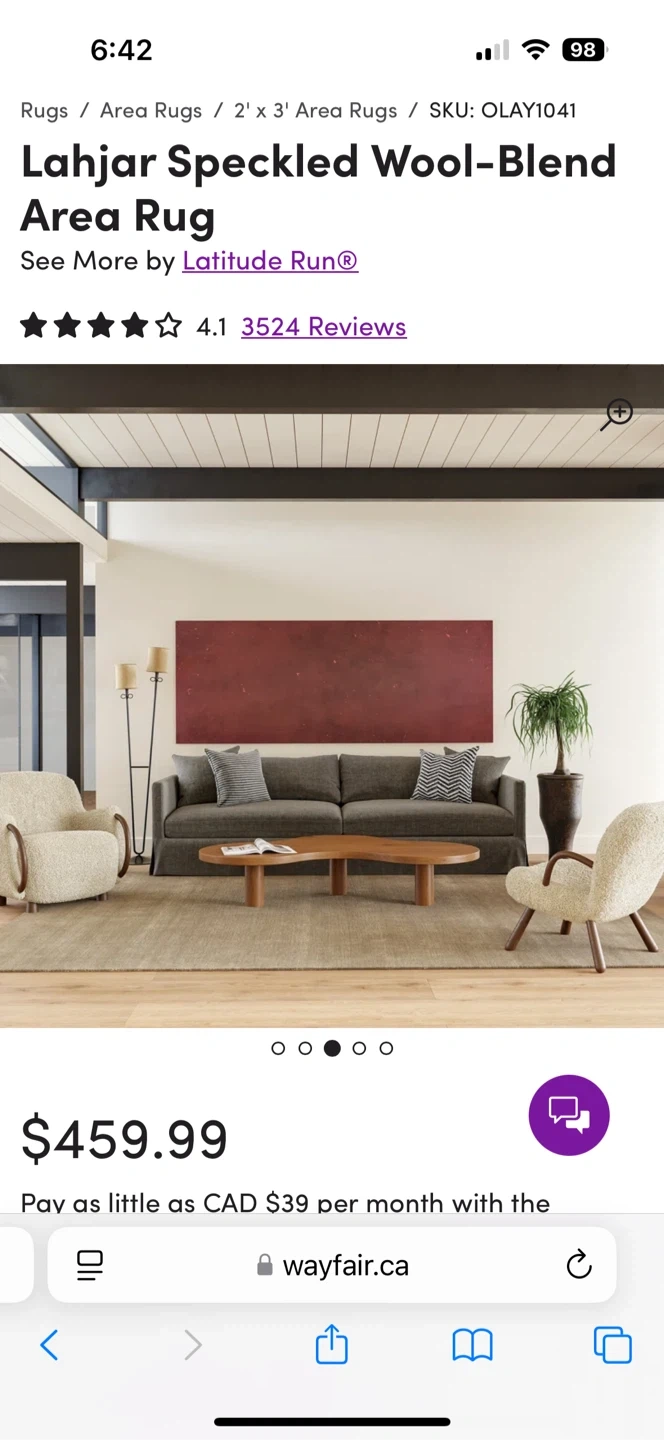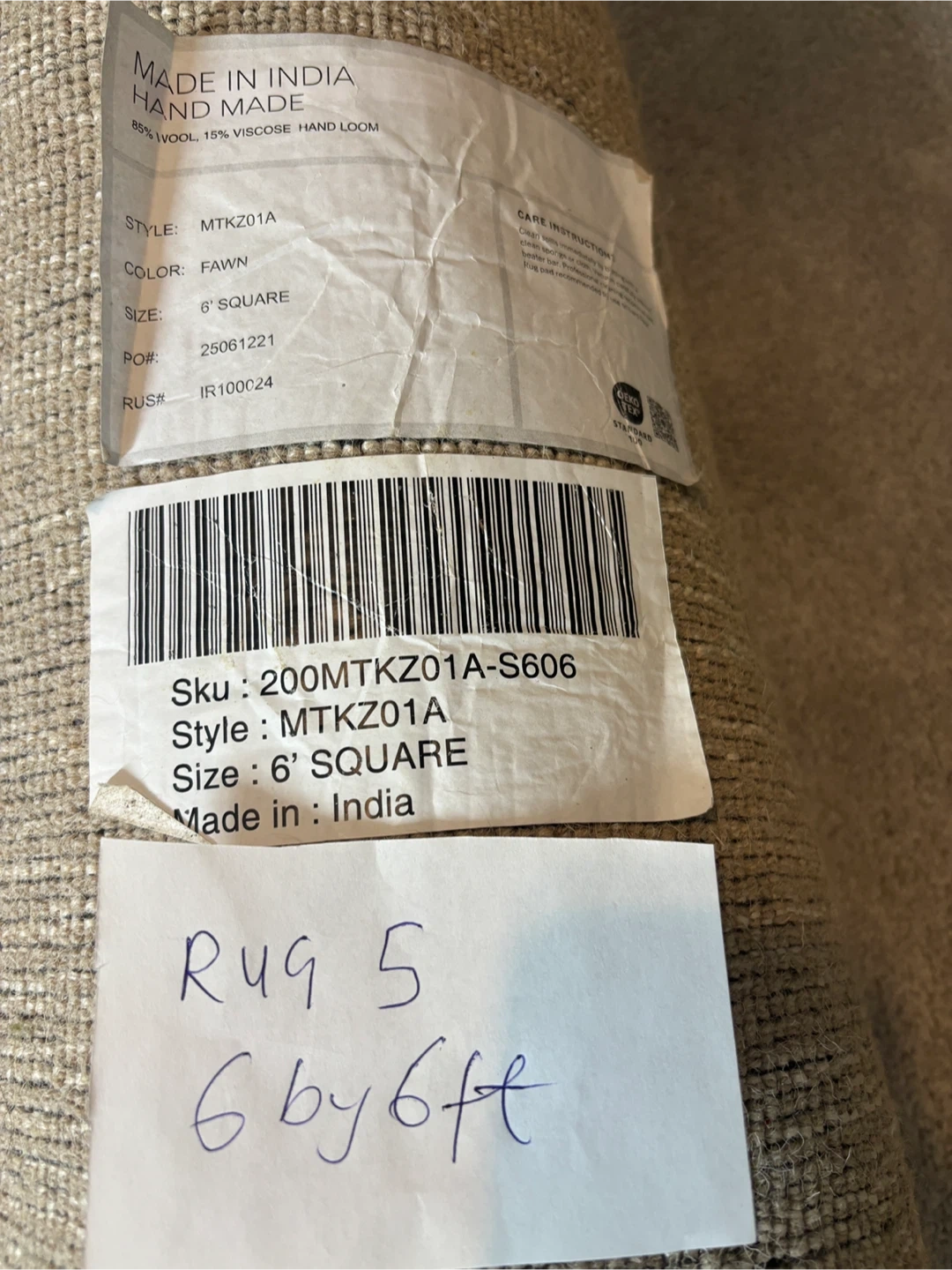 This is a 6' square rug, hand made in India. It's made of 85% wool and 15% viscose, and it's a fawn colour. This rug is suitable for a hand loom style! It's perfect for adding warmth to any room.