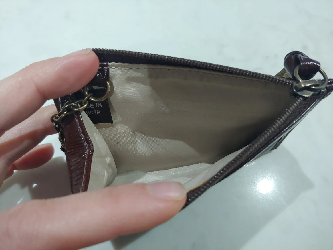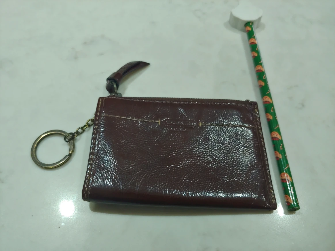 This is a cute little Coach coin purse in brown leather. It has a zipper closure and a key ring attached. It's perfect for carrying your loose change! Pencil is there for size. Exterior in like new condition, the interior has some pencil marks but no tears.