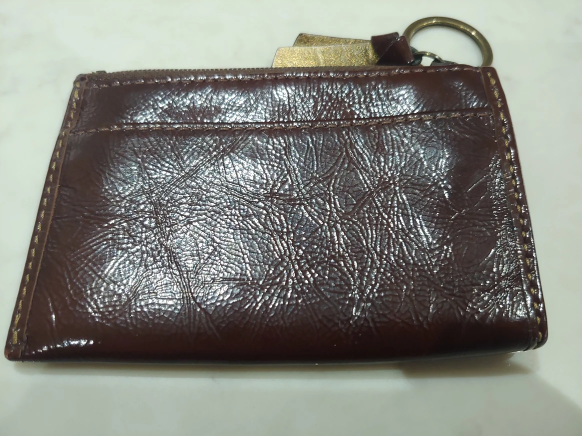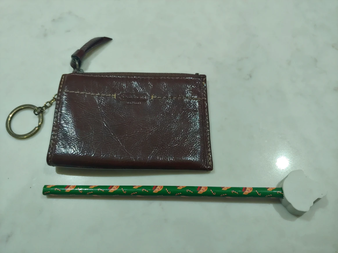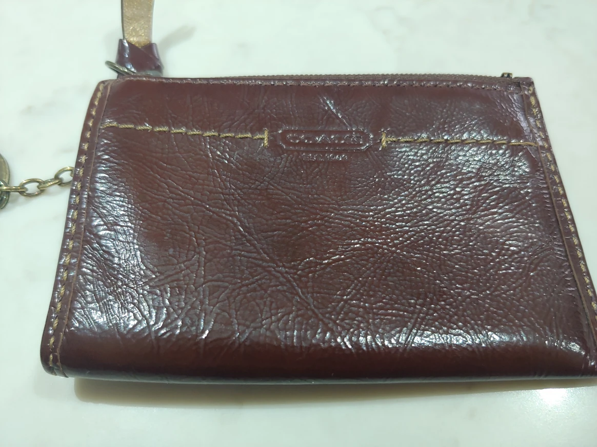 This is a cute little Coach coin purse in brown leather. It has a zipper closure and a key ring attached. It's perfect for carrying your loose change! Pencil is there for size. Exterior in like new condition, the interior has some pencil marks but no tears.