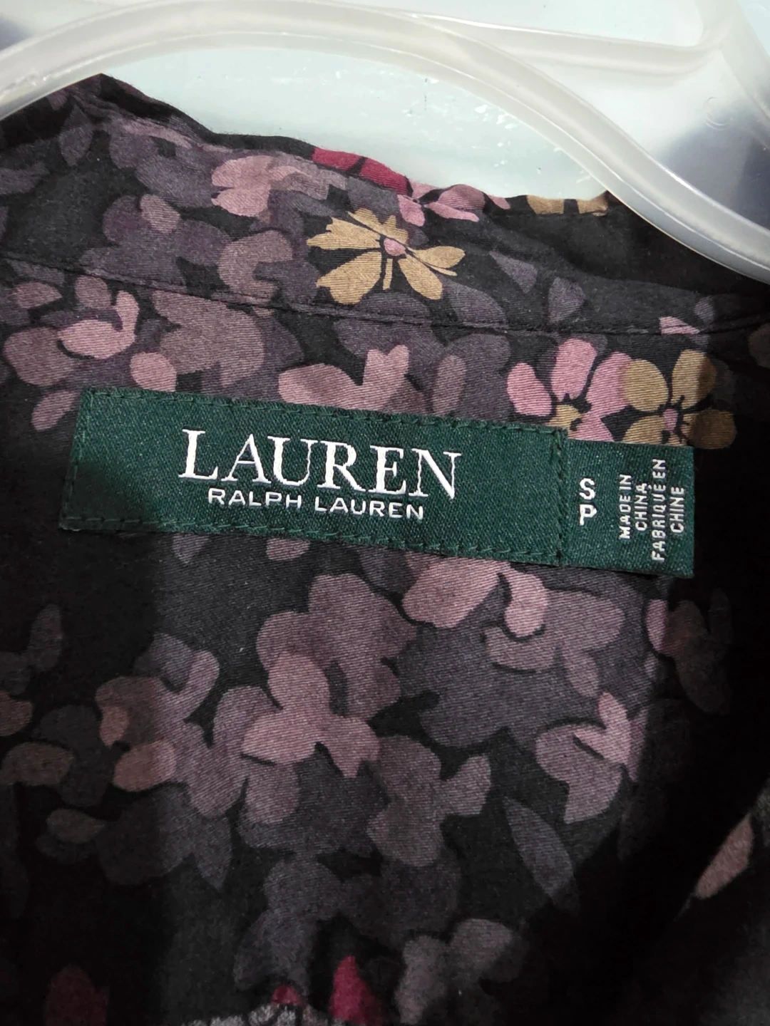 This Lauren Ralph Lauren button-down shirt features a dark floral print. There are 2 buttons at the wrist. It's made of 100% cotton. Slightly fitted. Size S.