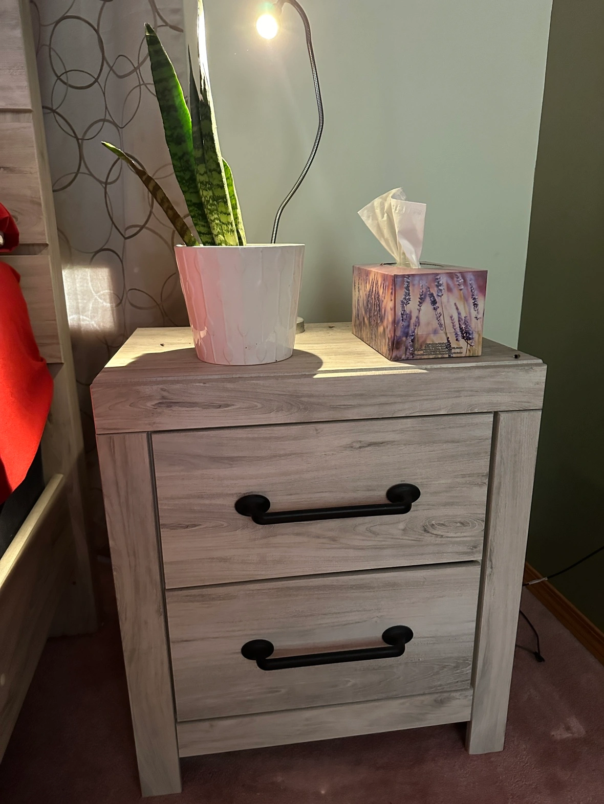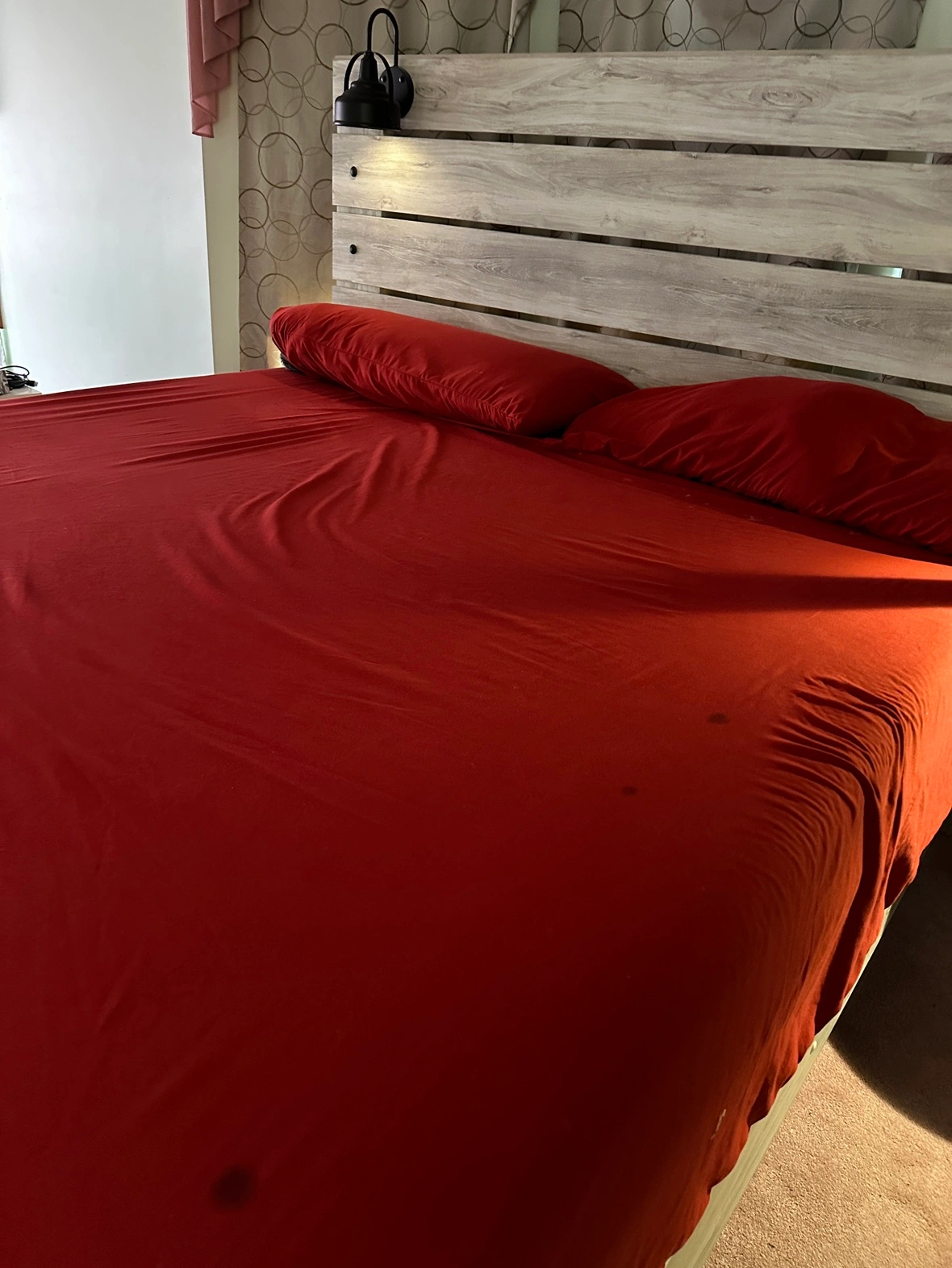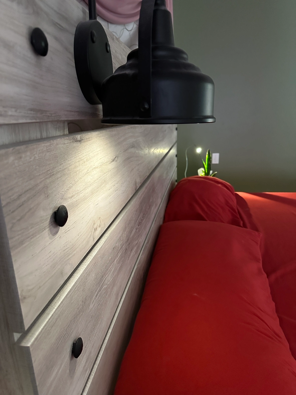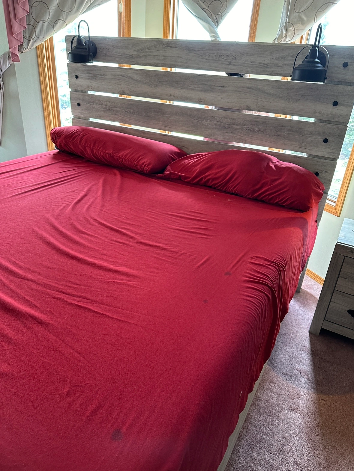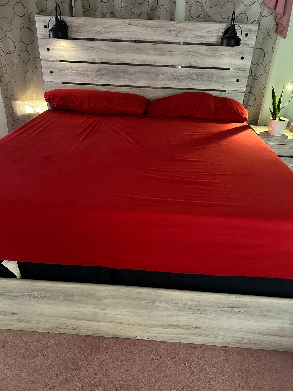 We are selling a luxurious king-size bed in top-notch condition for CAD $450. This stunning bed features a modern wooden headboard. The bed comes with two embedded battery operated night lights. The bed also comes with one matching bedside table, enhancing the overall aesthetic of your space.