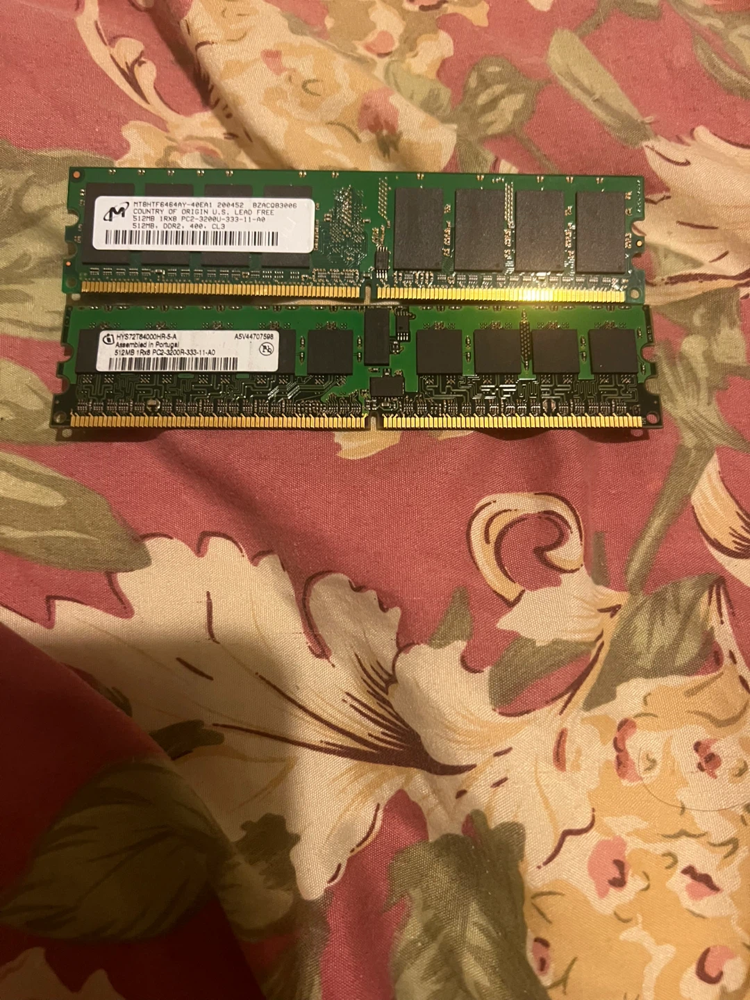 Selling two 512MB DDR2 RAM modules. One is MTBHTF6464AY-40EA1, 512MB 1RX8 PC2-3200U-333-11-A0. The other is HYS72T84000HR-5-A, 512MB 1Rx8 PC2-3200R-333-11-A0. These are great for upgrading older desktop computers!