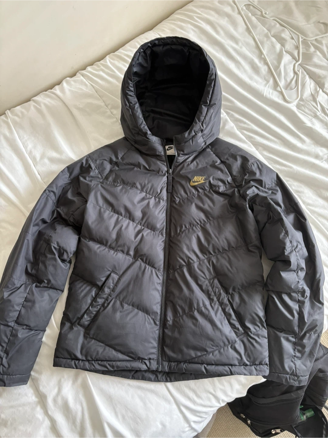 This Nike puffer jacket is black with a gold embroidered logo. It features a full zip closure and a hood for extra warmth. It's perfect for colder weather! Fits a size small men’s. Able to deliver.