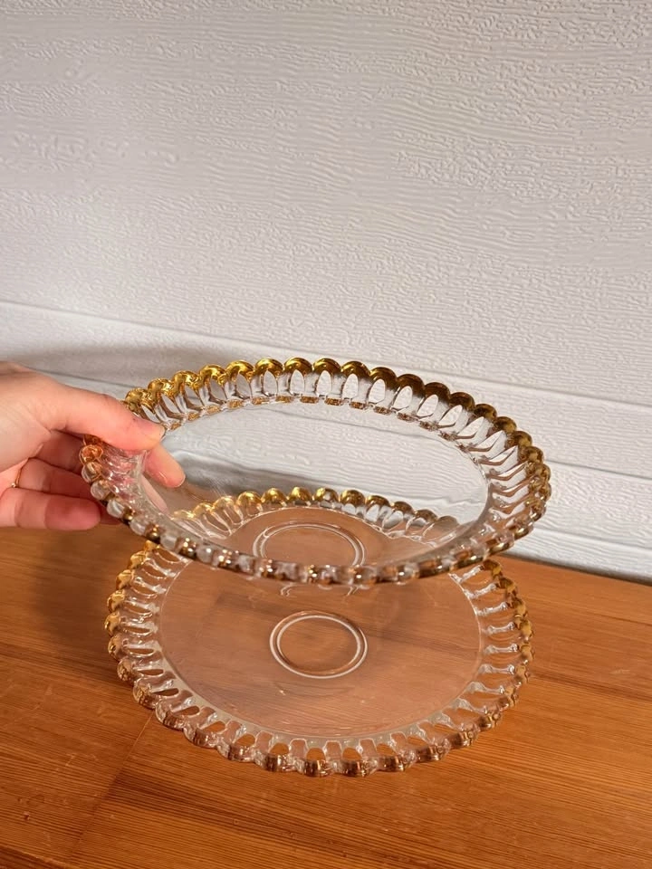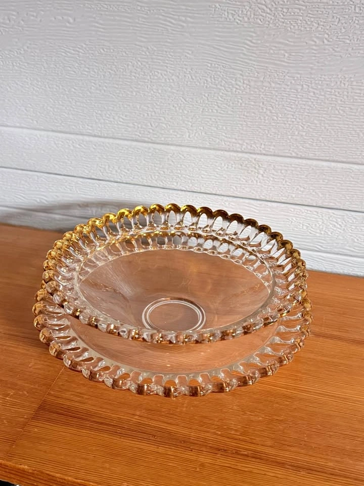 Pretty clear glass bowl and saucer dishes with gold scalloped edges. Comes as a set of two, one bowl and one plate/shallow bowl. Great for decor or serving.
