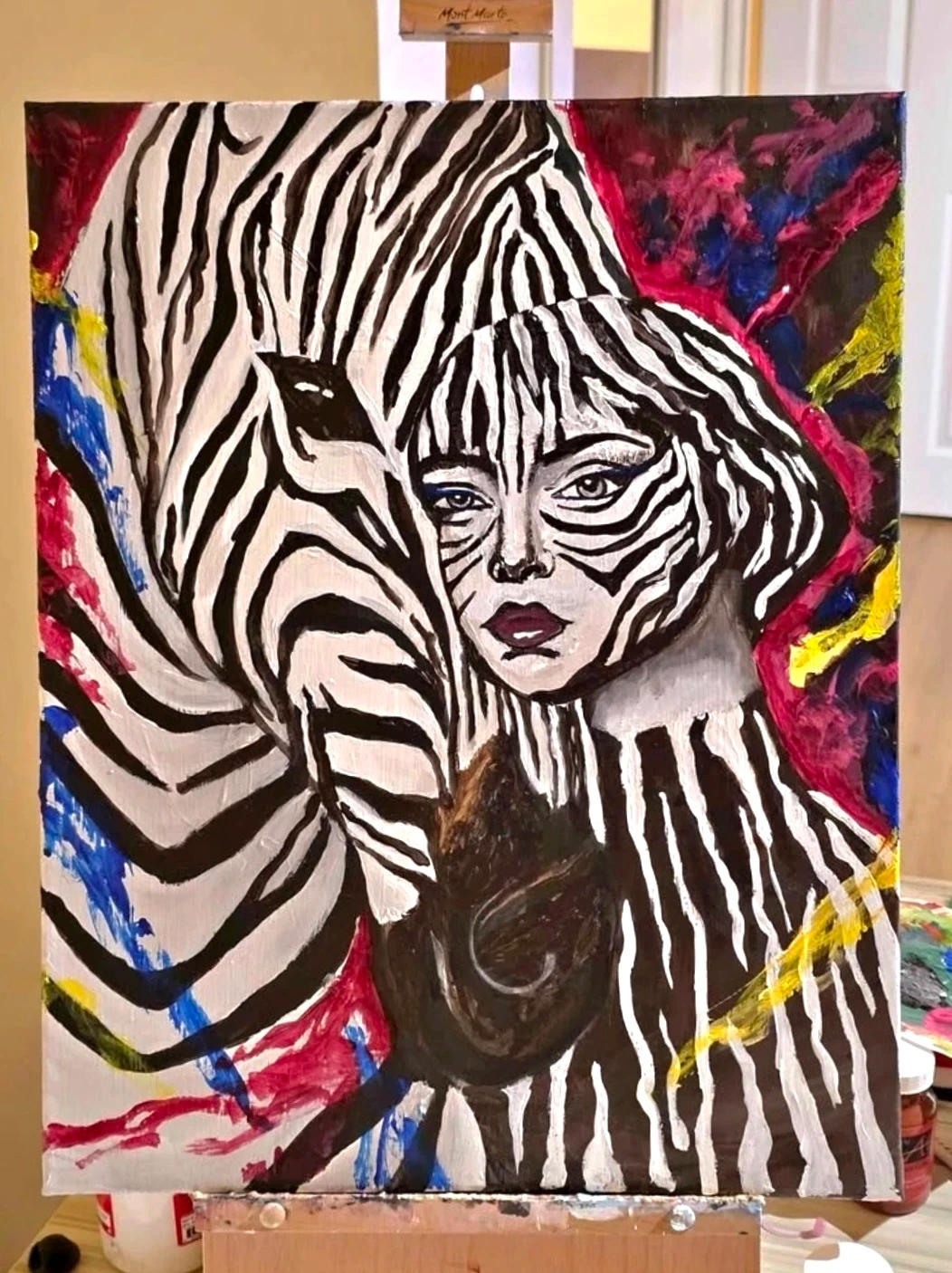 ZEBRA AND WOMAN ACRYLIC PAINTING