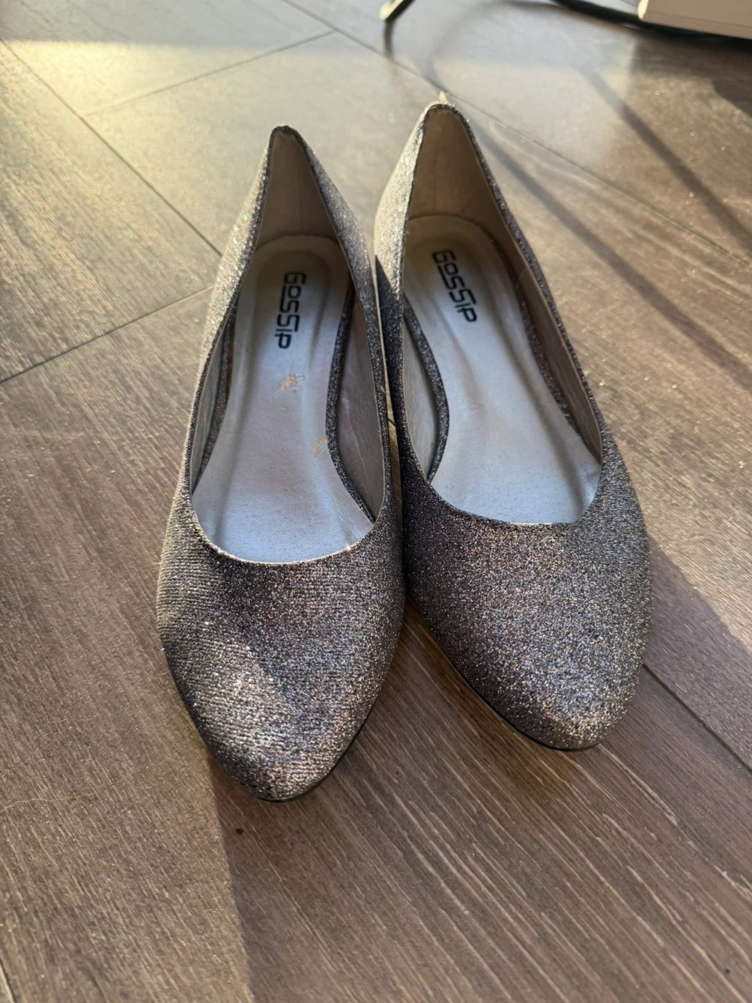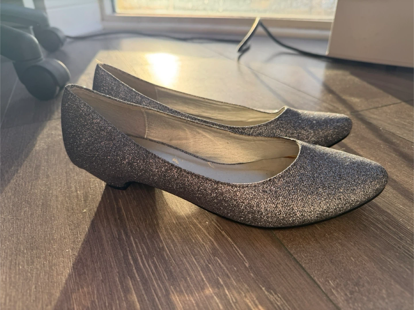Selling a pair of sparkly silver/lilac flats with rounded pointy toe. They're a size 37, never worn, in new condition.