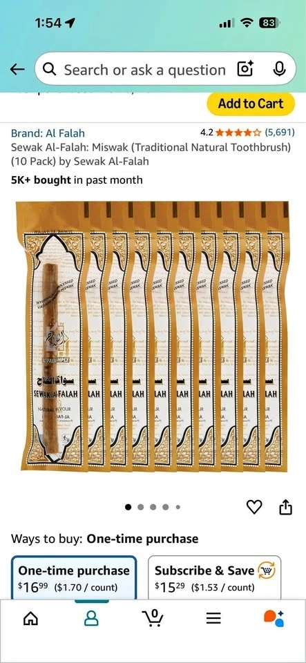 1 / 51 / 5Buy & SellArabic Natural Tooth Brushes/Sewak Al-FalahArabic Natural Tooth Brushes/Sewak Al-Falah$10Arabic Miswak natural oral care brushes. Brand new never used or opened. 8 brushes for sale.WHERE TO MEETCheck LocationView MapSELLERverifiedTracyForest Hills1366 reviews1 chats·2 favorites·14 viewsSEND CHAT TO SELLERHi Tracy! I’m interested in your listing.Hi Tracy! I’m interested in your listing.Get the Karrot app to chatSign In to chat