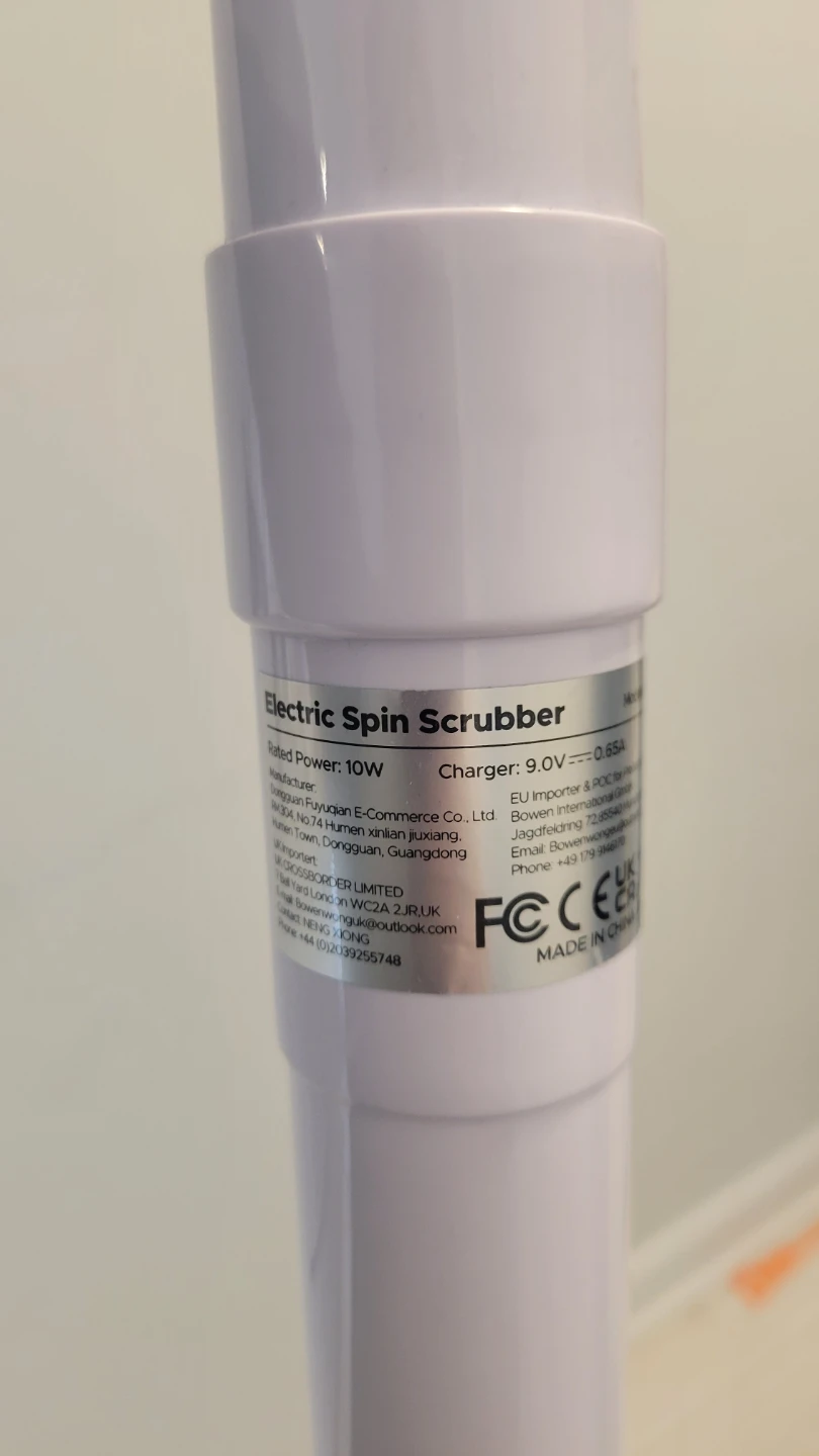 This is an electric spin scrubber designed for cleaning tasks. It comes with multiple brush heads for different surfaces. It's powered by a 9.0V charger and rated at 10W. This scrubber is useful for tackling tough grime in various areas of your home. Can't find the charger.