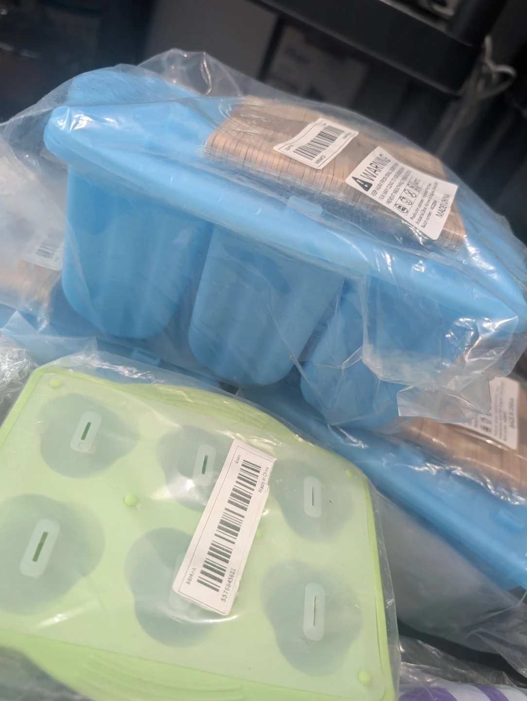 I'm selling these popsicle molds. They come in a variety of shapes and colours, including blue, green, and white. Perfect for making homemade popsicles this summer!