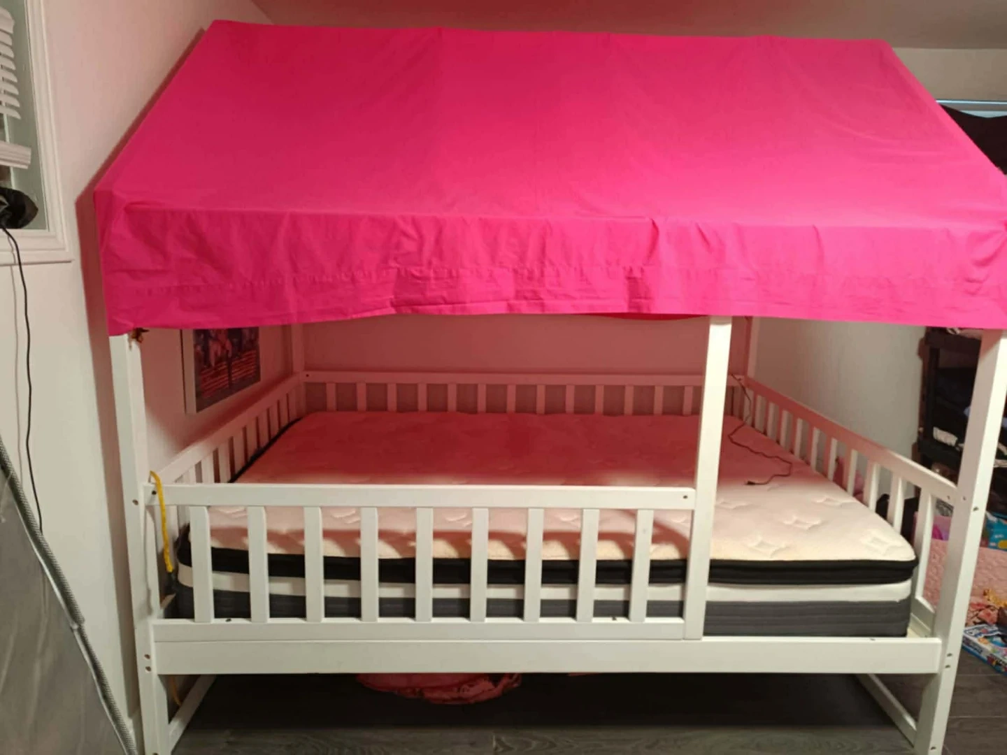 White wooden bed frame designed like a house with a vibrant pink fabric canopy. It includes guardrails for safety. A mattress is shown in place. Great for a child's bedroom! 140x200
