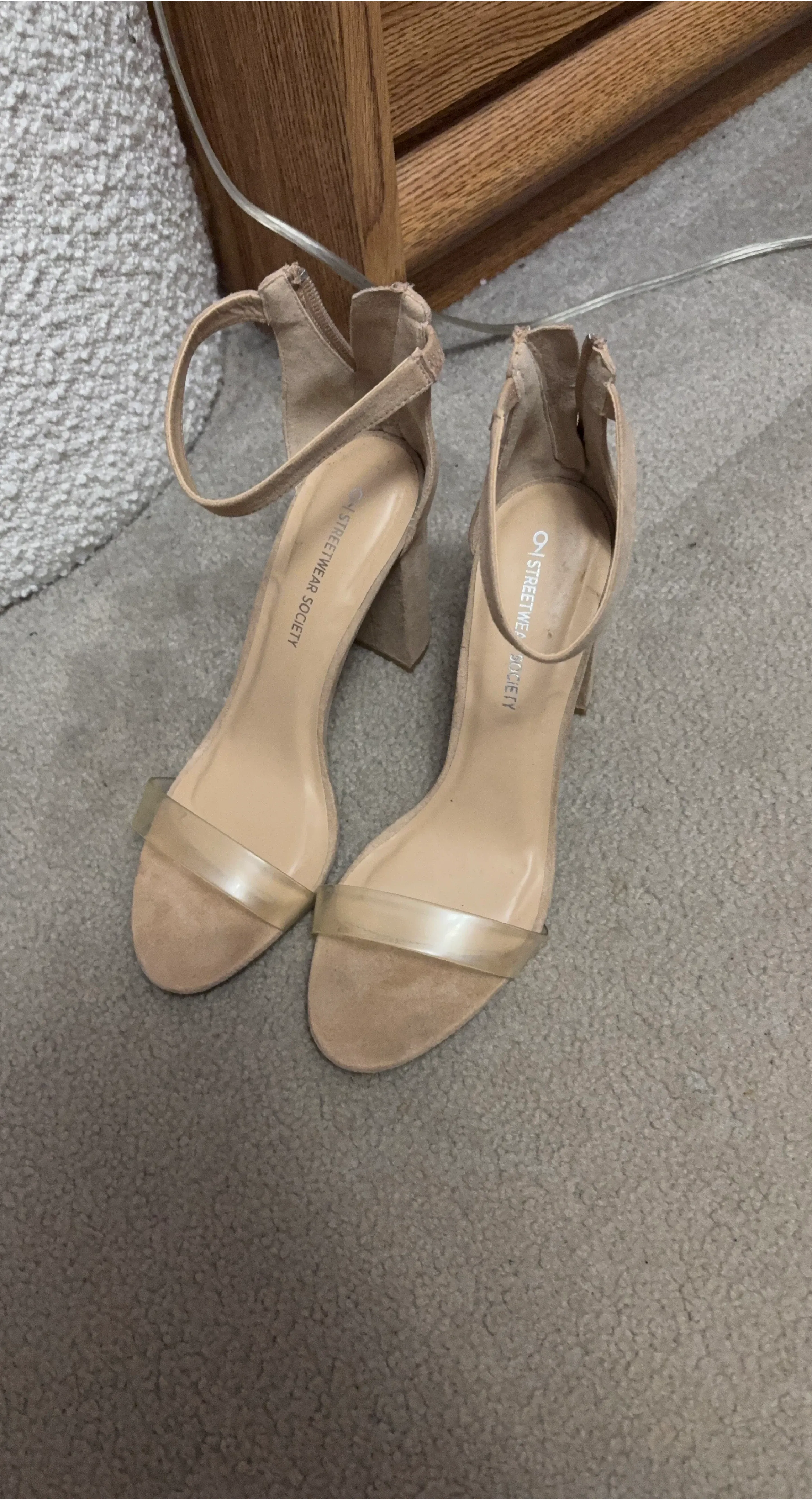 These stylish heels from Streetwear Society feature a beige suede material with a clear strap across the toes. The ankle strap has a zip closure for easy on and off. Block heel for added comfort.