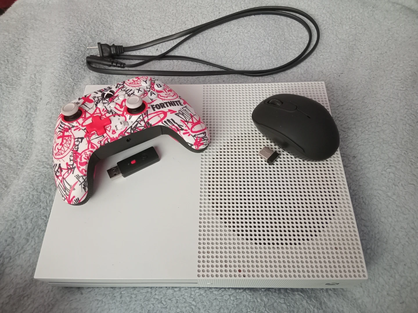 Xbox One S console in white. Includes a wireless controller, power cord, and wireless adapter. Great for gaming! Will also come with an HDMI cord