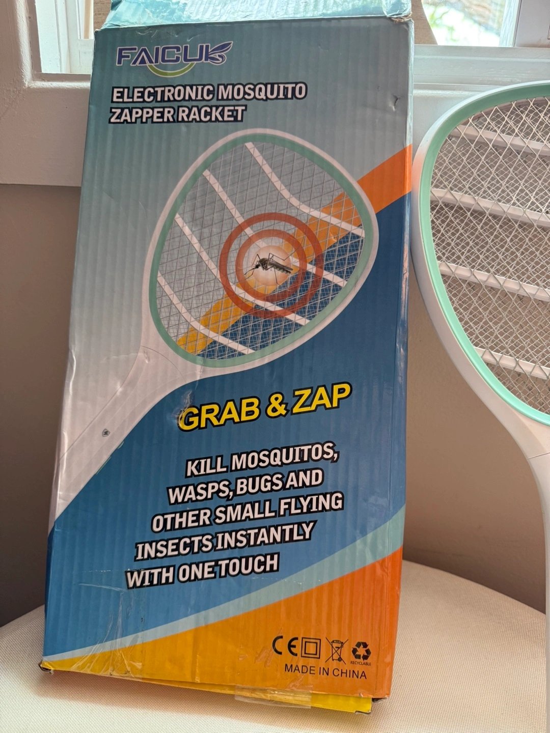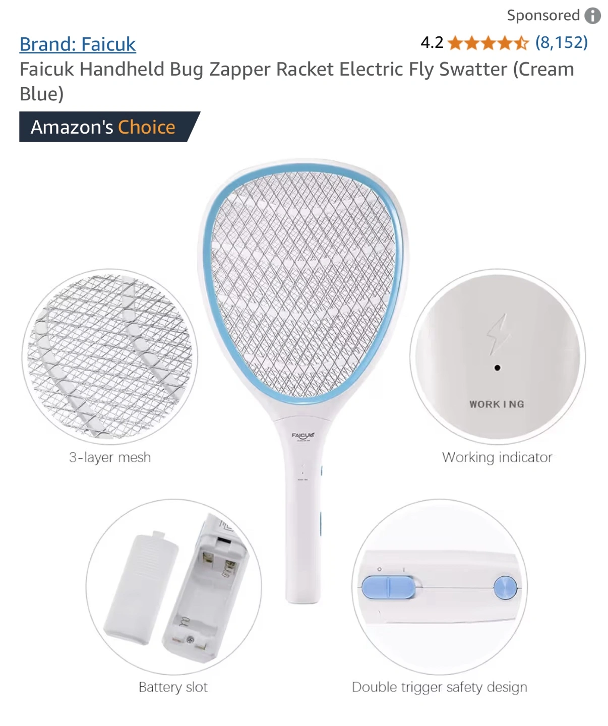 New. Open-box.Electric fly swatter racket. Features a white handle with blue trim. Includes a 3-layer mesh. It can help make those nights a little easier.