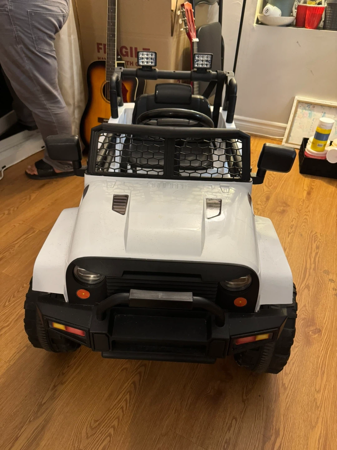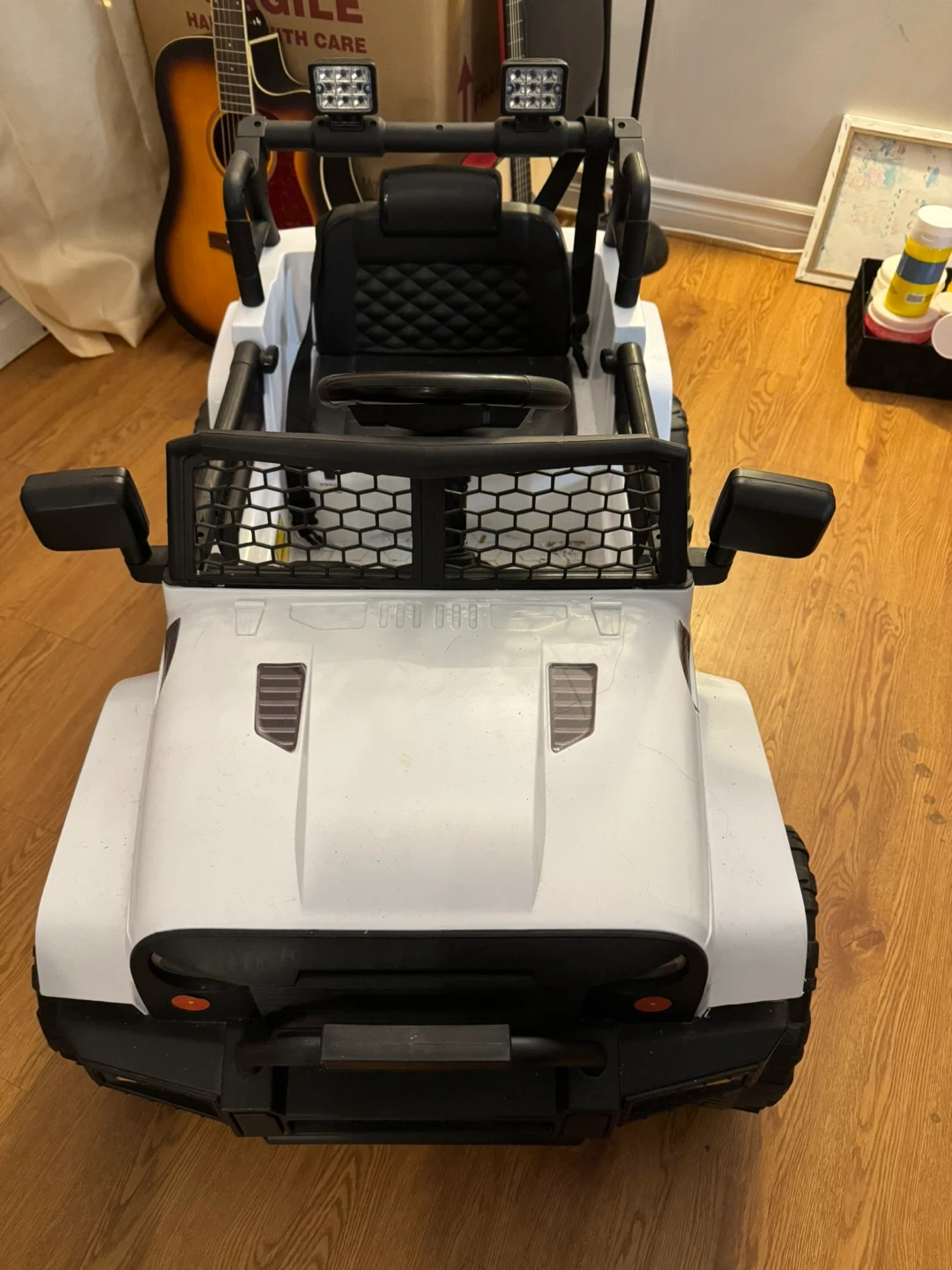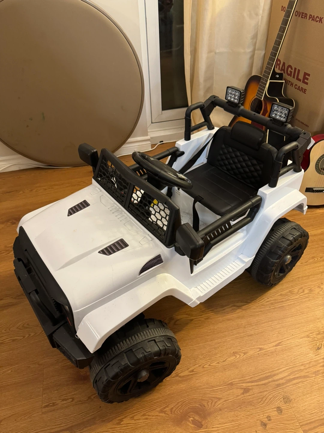 This white ride-on Jeep is a fun toy for kids. It's designed with a realistic look and features working lights. Built for outdoor adventures!