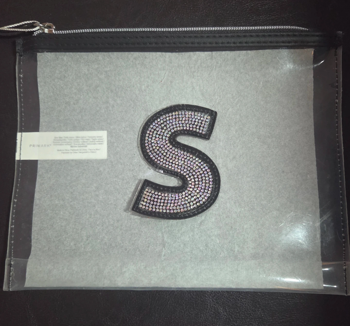 This is a clear zip-top pouch from Primark. It features a large, sparkling 'S' embellishment made of rhinestones. Useful for organizing makeup or small accessories. It's a handy size for travel!