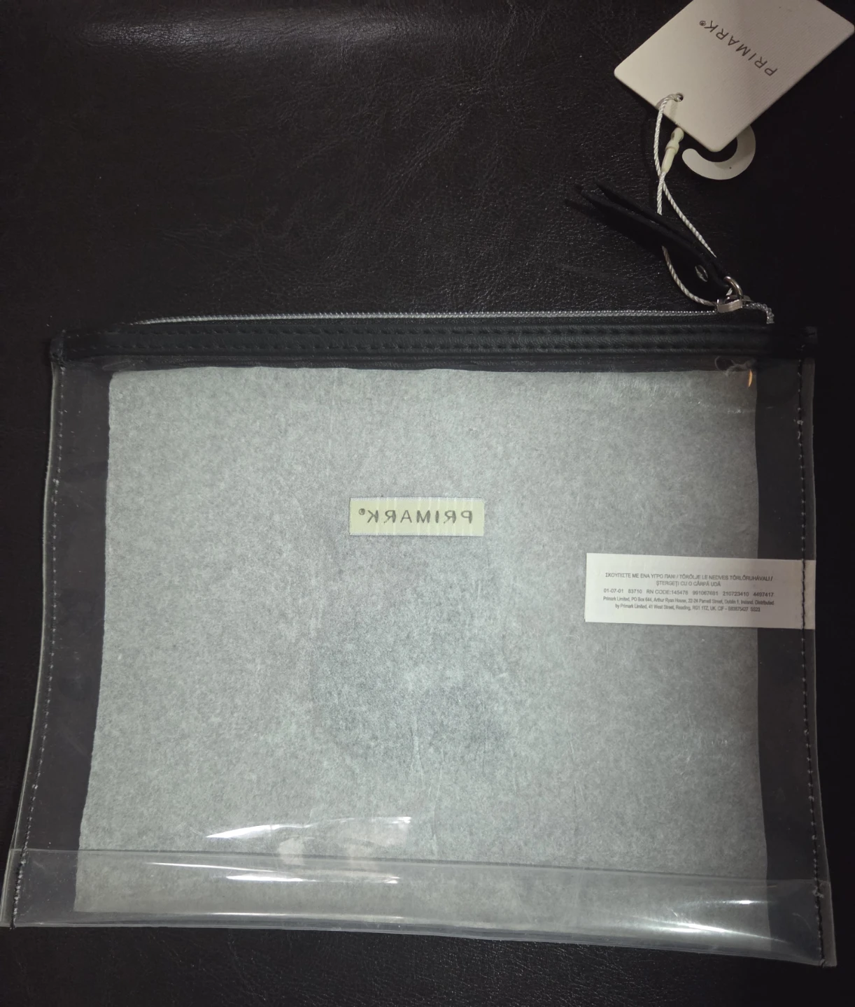 This is a clear zip-top pouch from Primark. It features a large, sparkling 'S' embellishment made of rhinestones. Useful for organizing makeup or small accessories. It's a handy size for travel!
