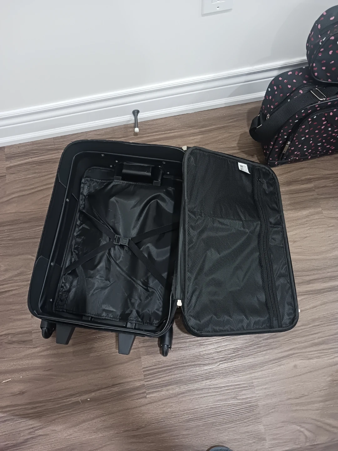 This Jetstream luggage set includes a suitcase, a carry-on bag, and a cosmetic bag. All pieces feature a black base with a pink and white petal pattern. They're made of durable fabric for travel. Used once