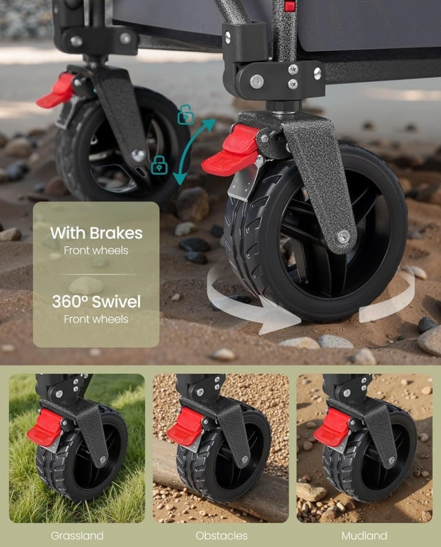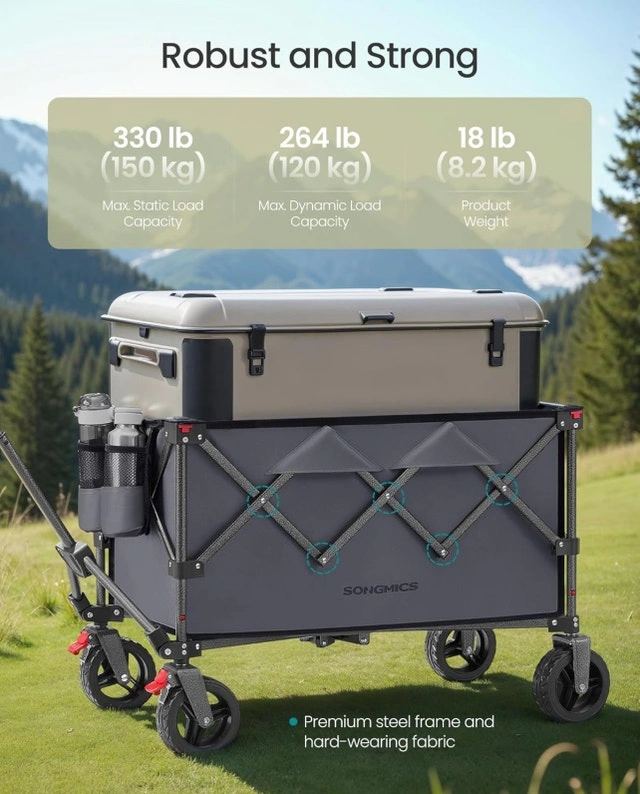 This SONGMICS folding wagon cart is brand new, ready to haul your gear with ease! It boasts a robust steel frame and durable fabric, capable of carrying up to 150 kg (330 lbs) statically or 120 kg (264 lbs) dynamically. The front wheels swivel 360° and include brakes for easy maneuvering and secure parking. Perfect for camping, shopping, or a day at the beach! Specifications: Max Static Load Capacity: 150 kg (330 lb), Max Dynamic Load Capacity: 120 kg (264 lb), Product Weight: 8.2 kg (18 lb), Features: Premium steel frame, hard-wearing fabric, front wheel brakes, 360° swivel wheels. If the ad is up, it's still available!