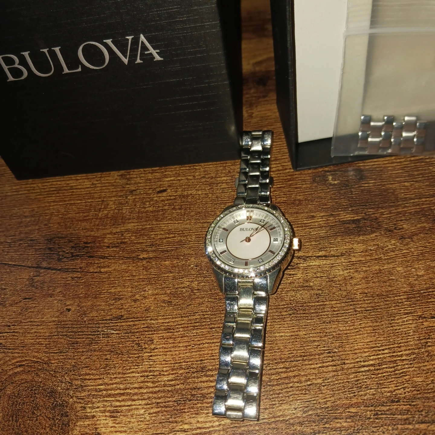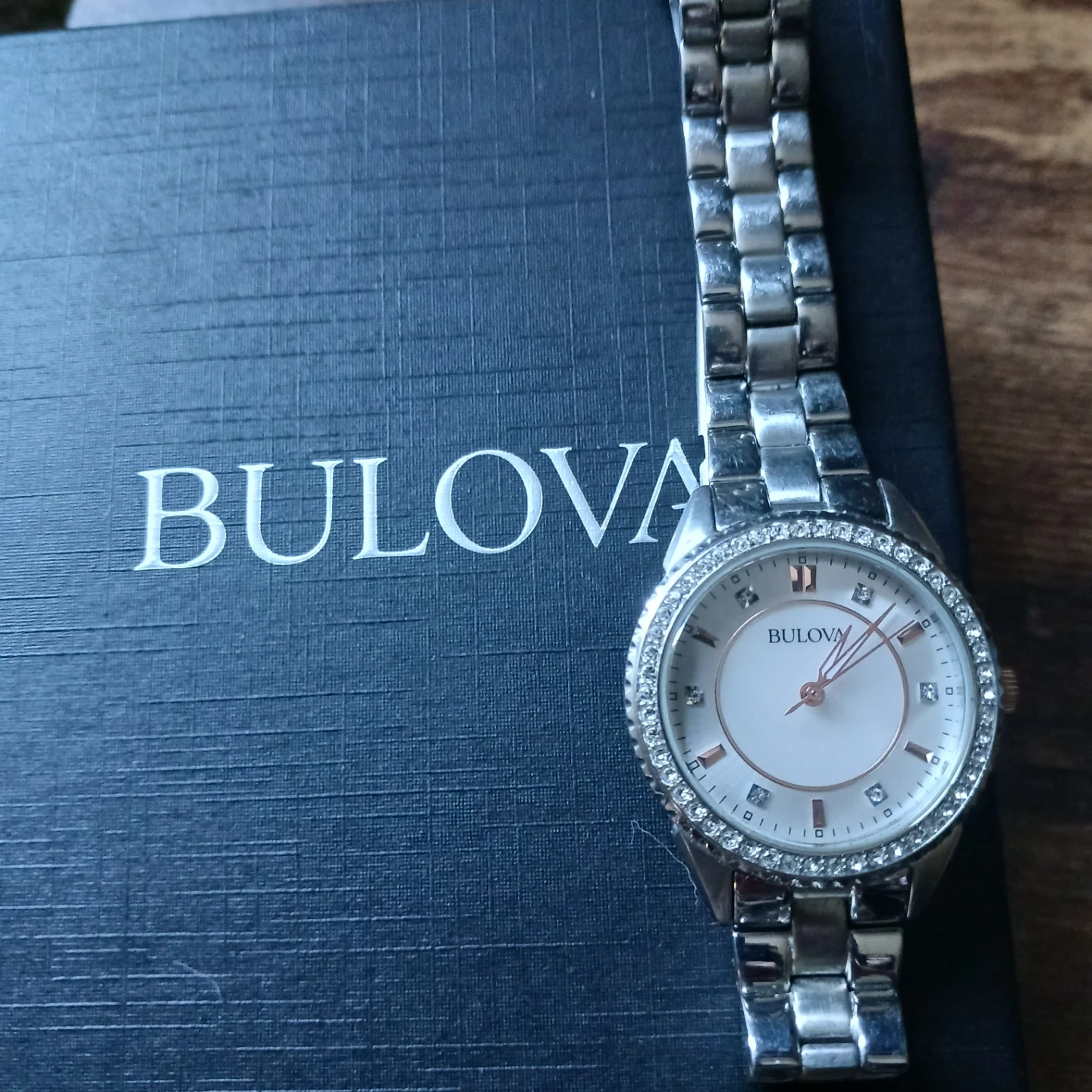 Bulova women's watch with a silver-tone stainless steel band. It features a round white dial with rose gold-tone hands and markers, and a sparkling crystal-embellished bezel. Includes original box.