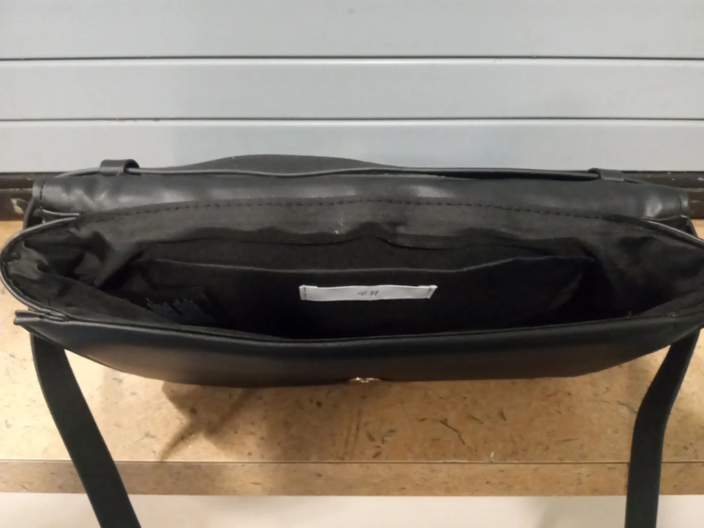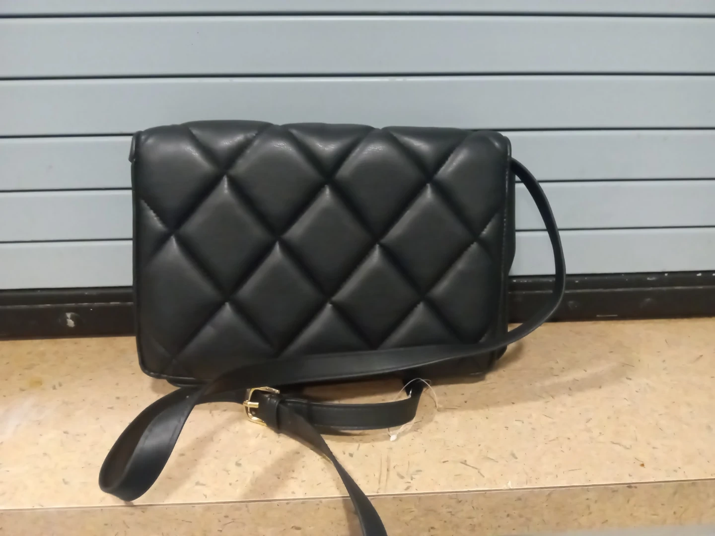 A black quilted shoulder bag. It's made of faux leather and has a secure closure. This bag's the perfect size for essentials!