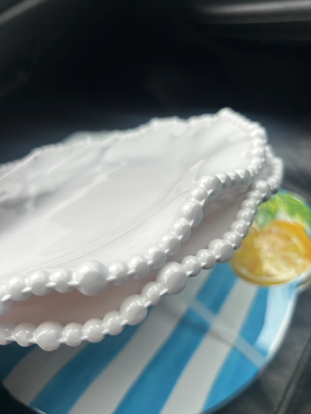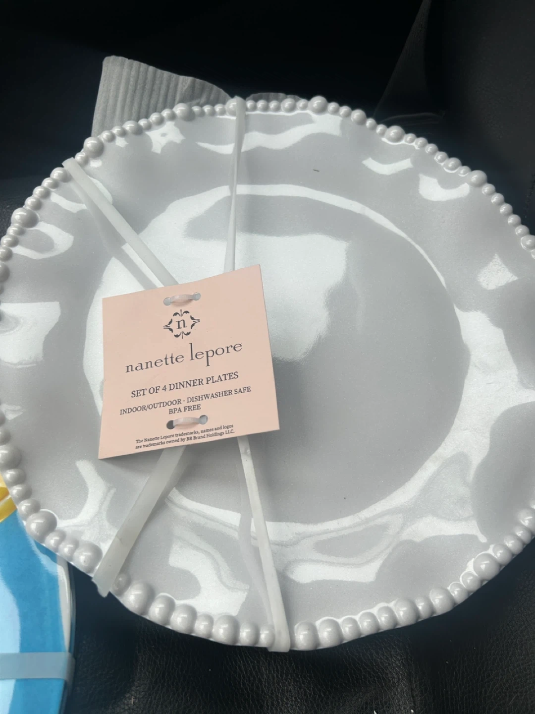 Set of 2 Nanette Lepore dinner plates. These are indoor/outdoor, dishwasher safe, and BPA free. White beaded edge design.