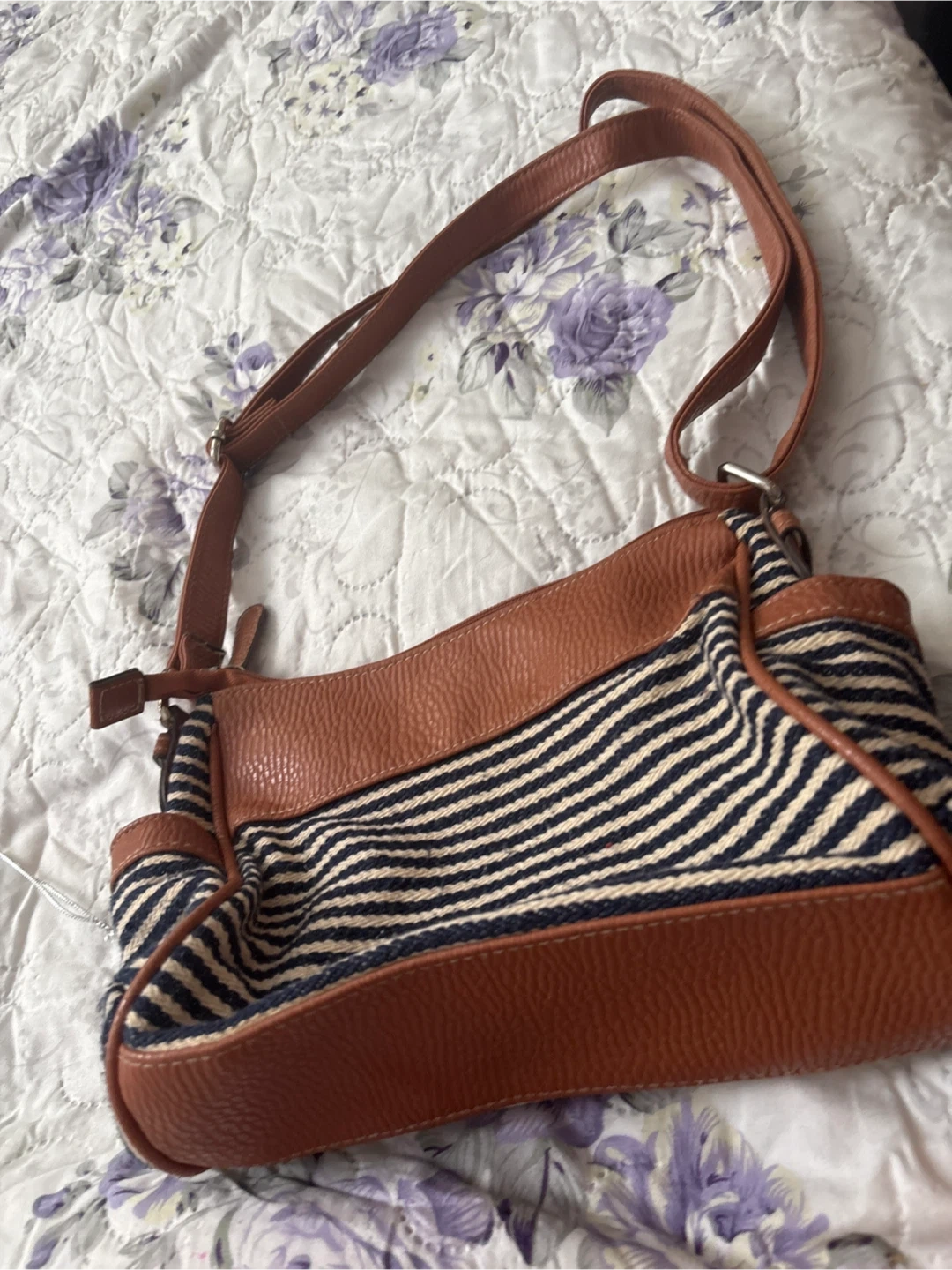 This is a stylish shoulder bag with brown faux leather accents and a black and white striped fabric body. It features a zip closure and an exterior zip pocket. It's great for everyday use!
