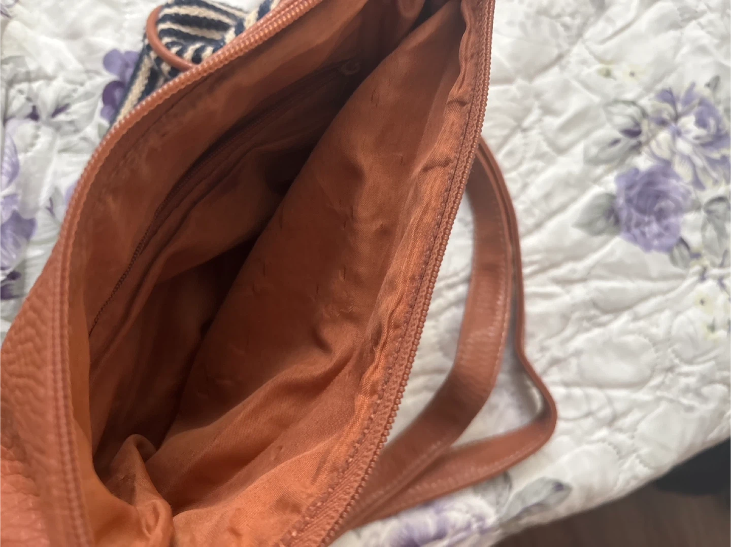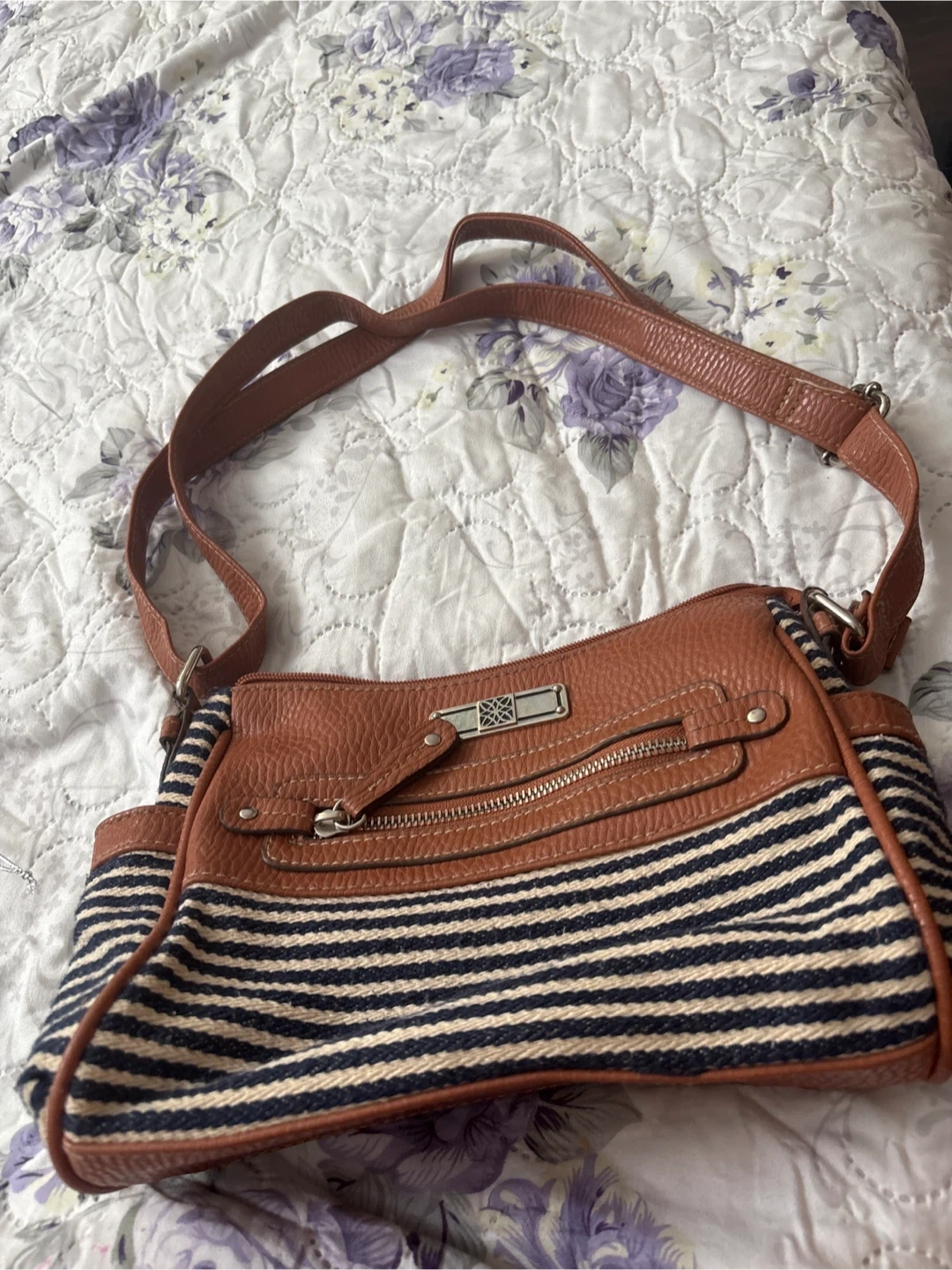This is a stylish shoulder bag with brown faux leather accents and a black and white striped fabric body. It features a zip closure and an exterior zip pocket. It's great for everyday use!