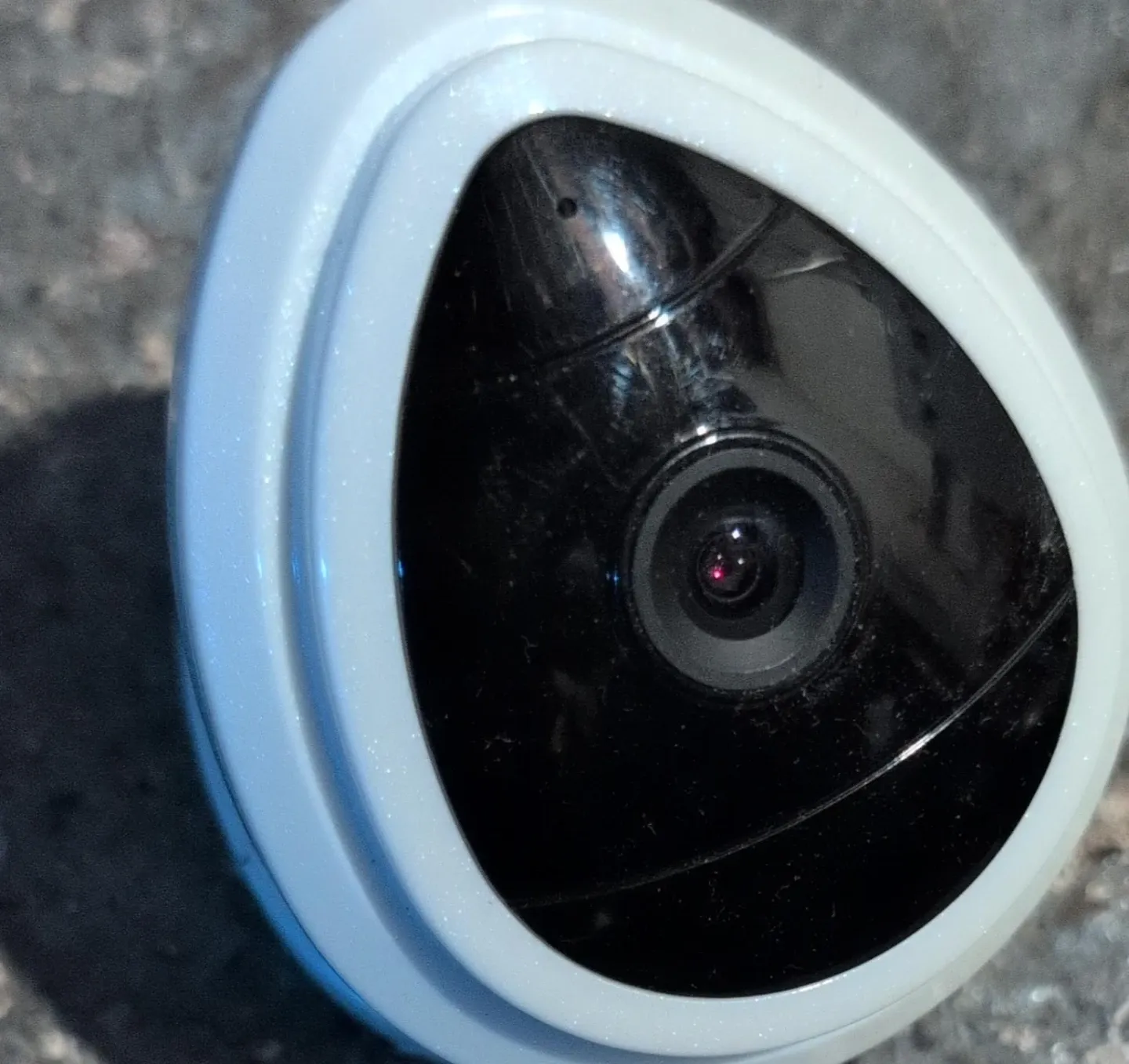 This is a dome security camera. It's white and black with a shiny finish. It features a wide-angle lens for a broad view. Use this camera for home or business security!