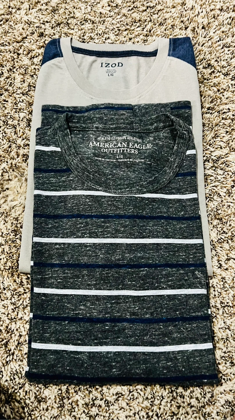 Includes one IZOD t-shirt and one American Eagle Outfitters t-shirt. Both shirts are size L. They're great for casual wear. TAKE ALL
