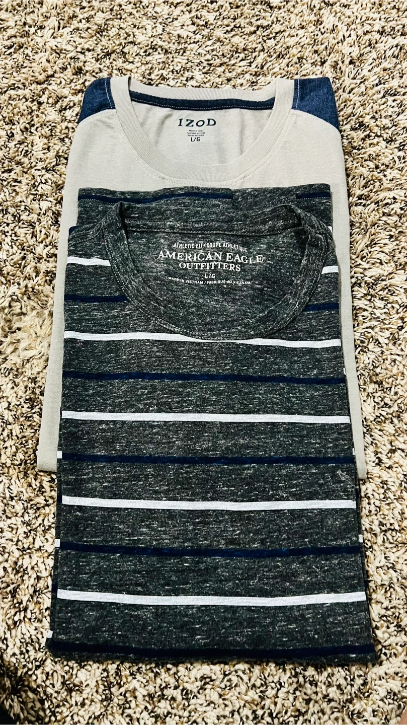 Includes one IZOD t-shirt and one American Eagle Outfitters t-shirt. Both shirts are size L. They're great for casual wear. TAKE ALL