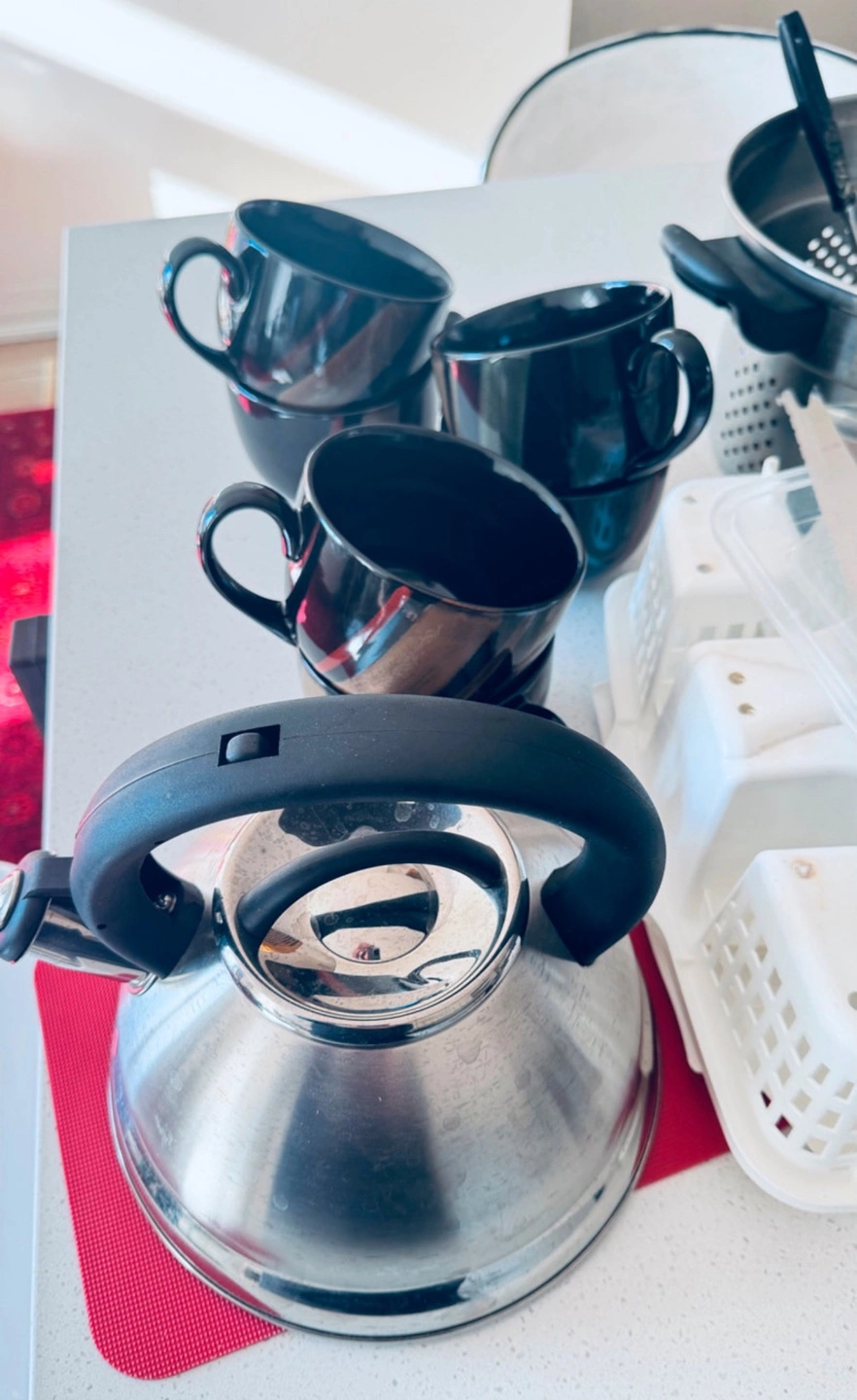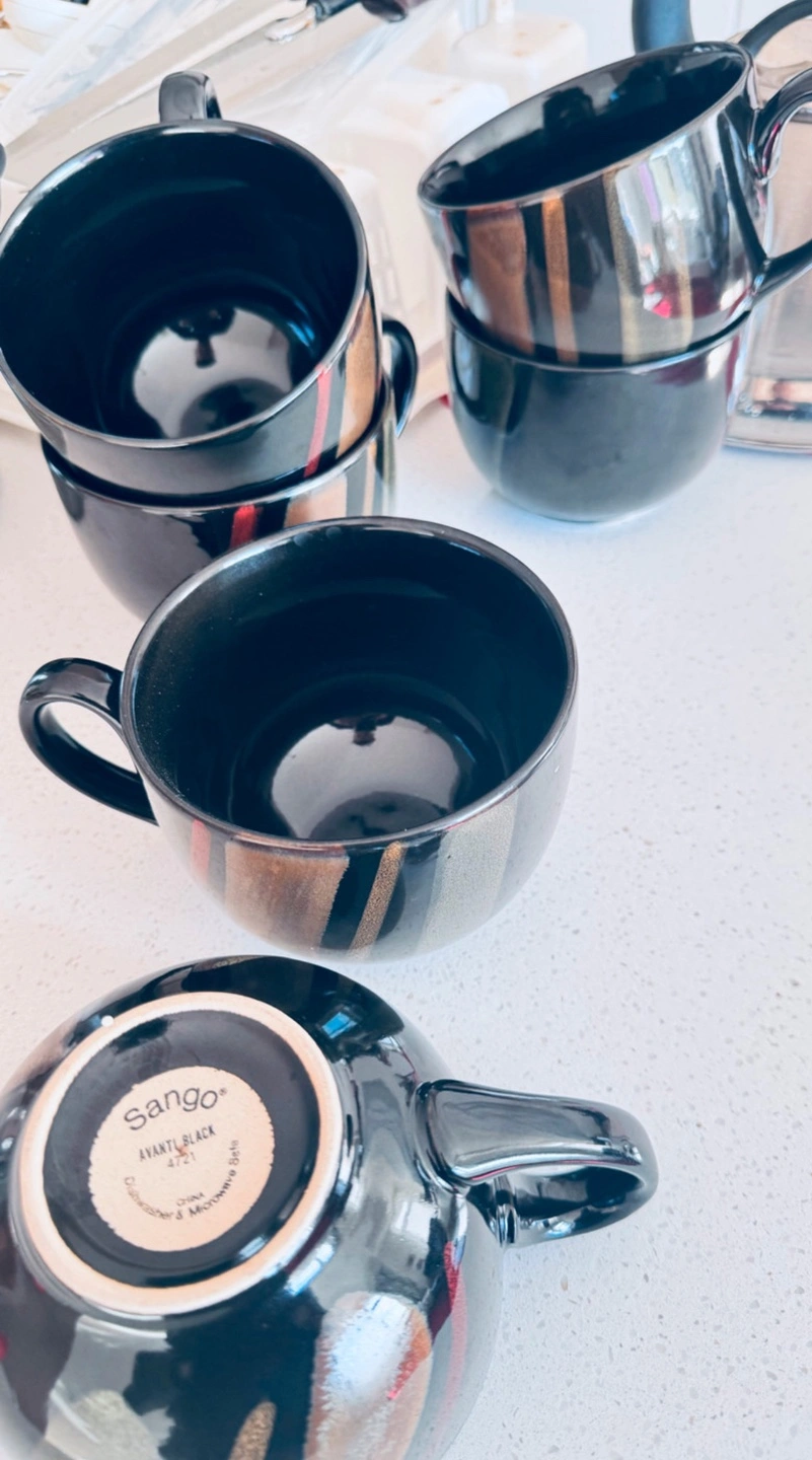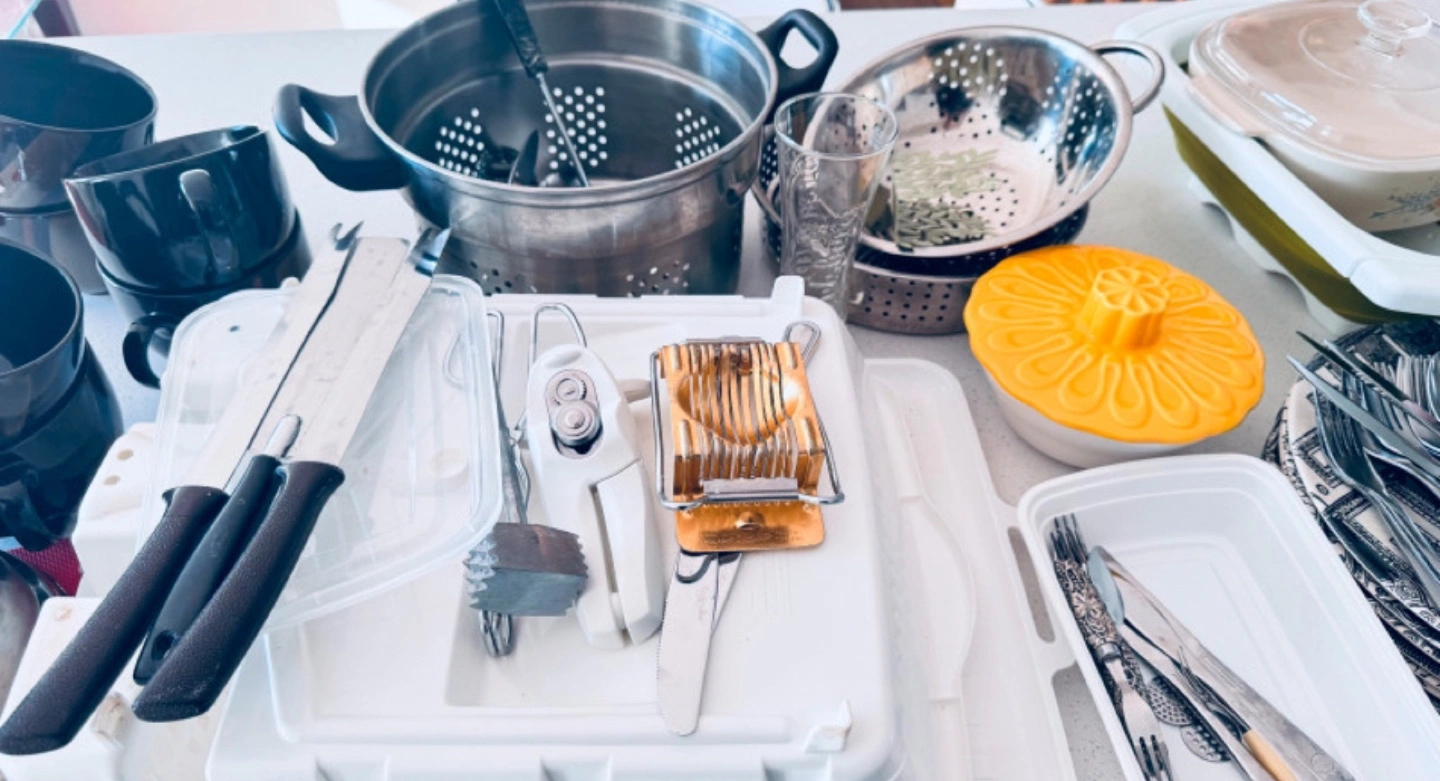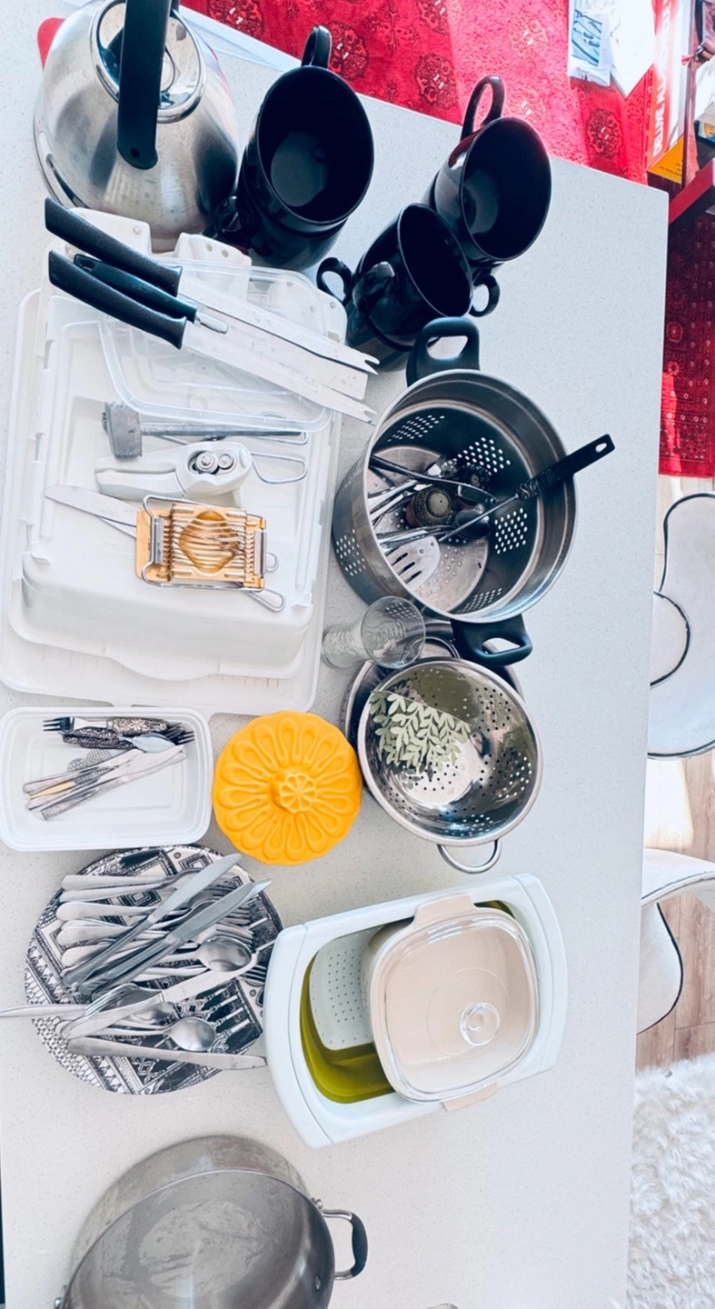 Large kitchen bundle. Includes various pots, pans, and utensils. Set of mugs, cutlery, and dinnerware. Egg slicer and meat mallet included. Great for students or those starting a new home.
