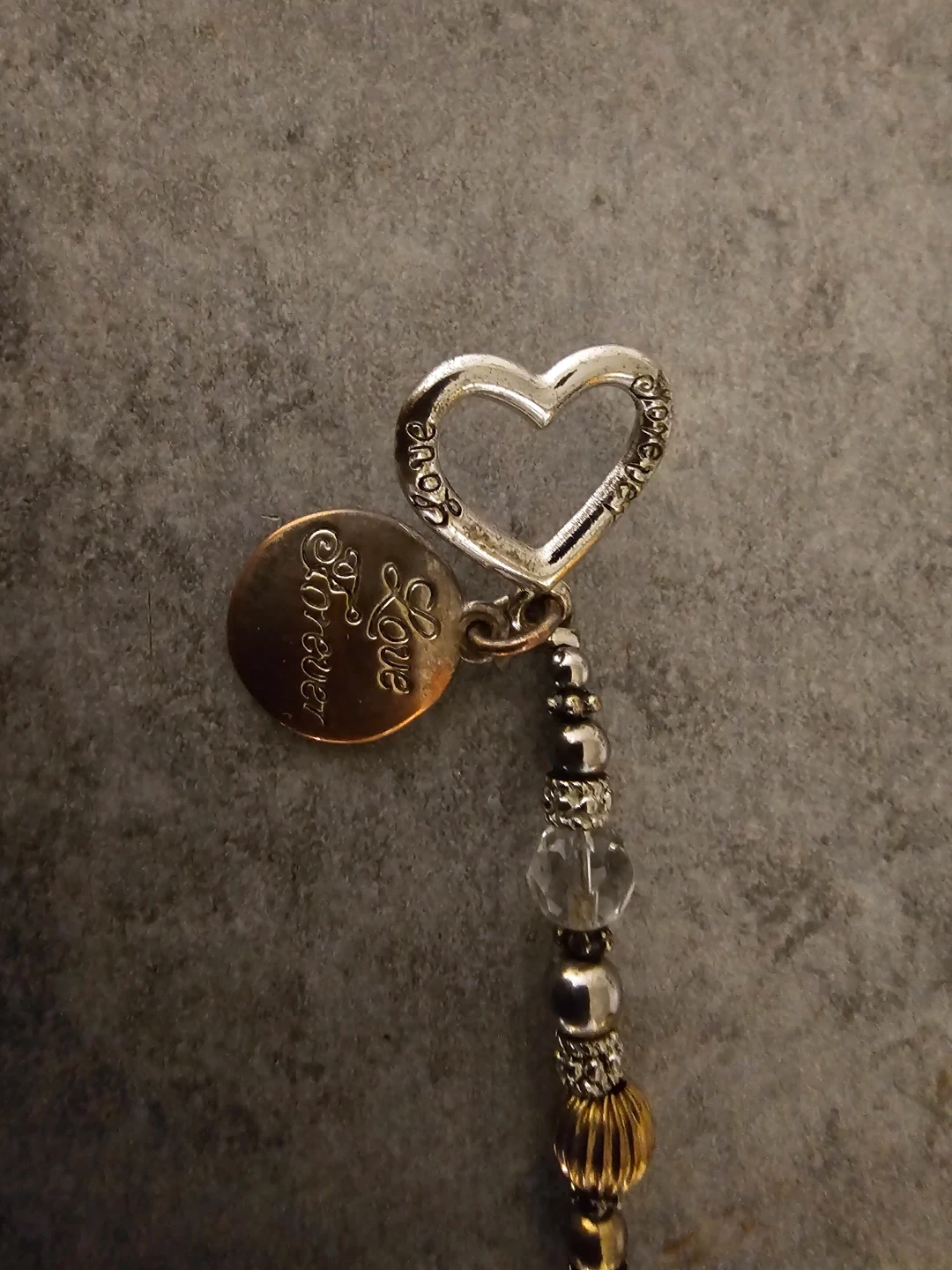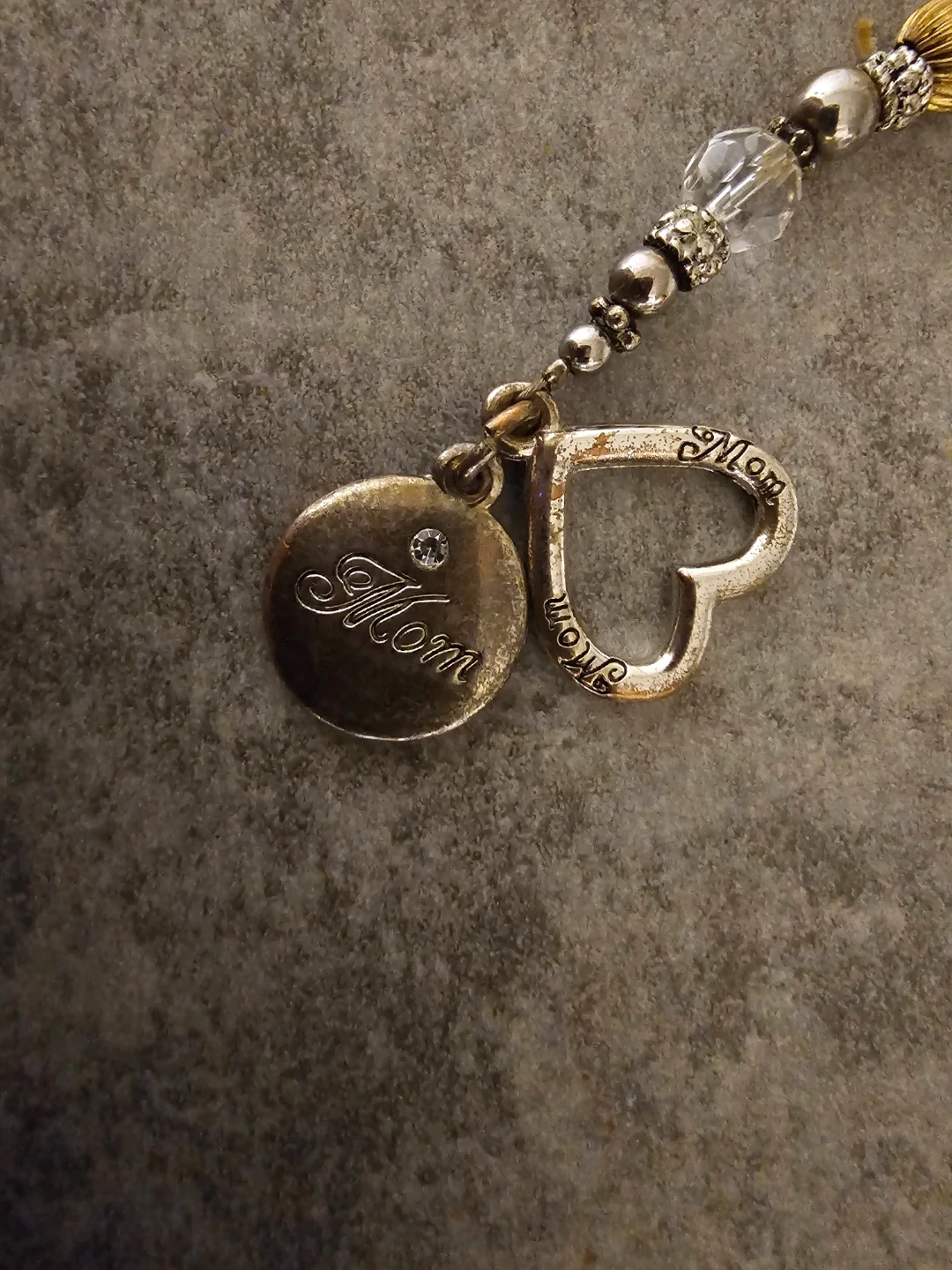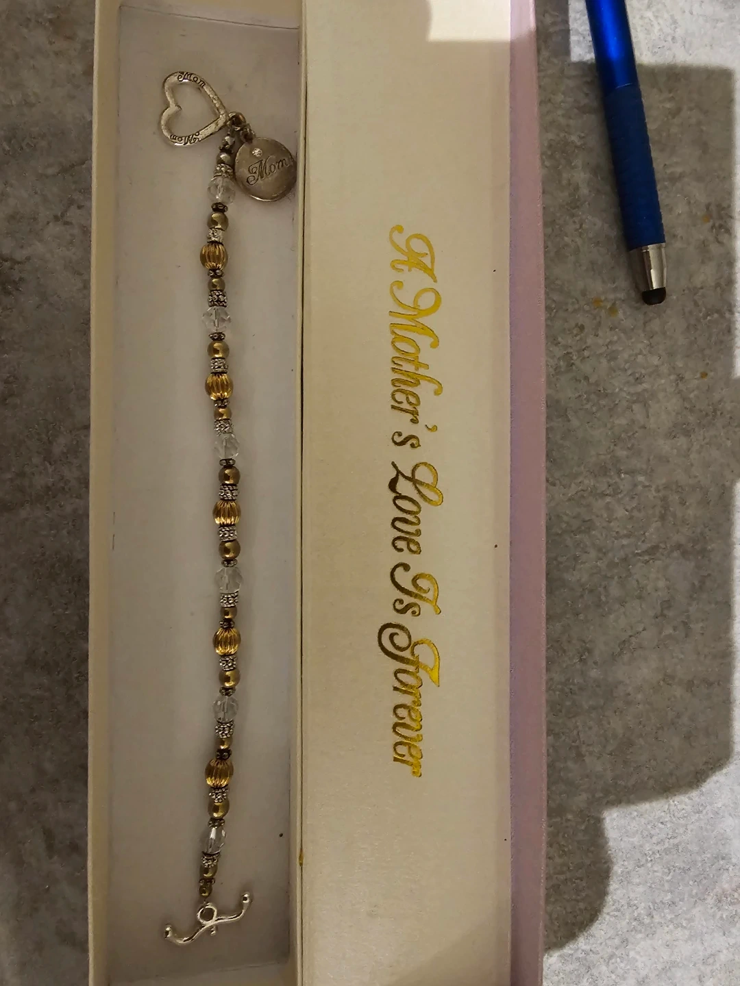 This beautiful charm bracelet features a "Mom" pendant and a heart charm. It's adorned with clear beads and gold-toned accents. The bracelet comes with a "A Mother's Love Is Forever" box. It's a lovely gift for any mother!