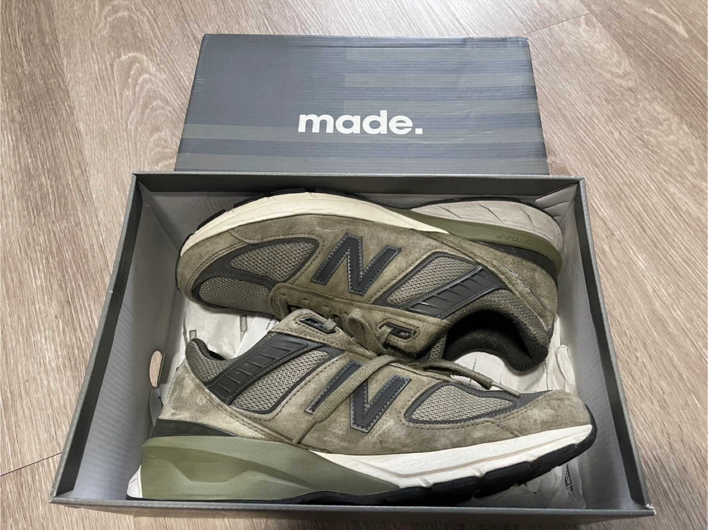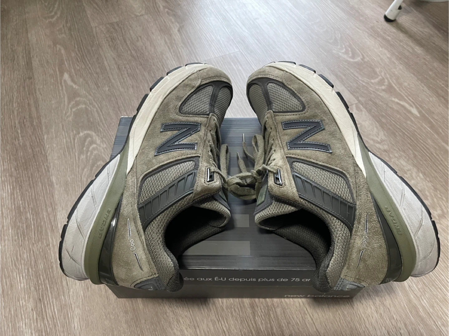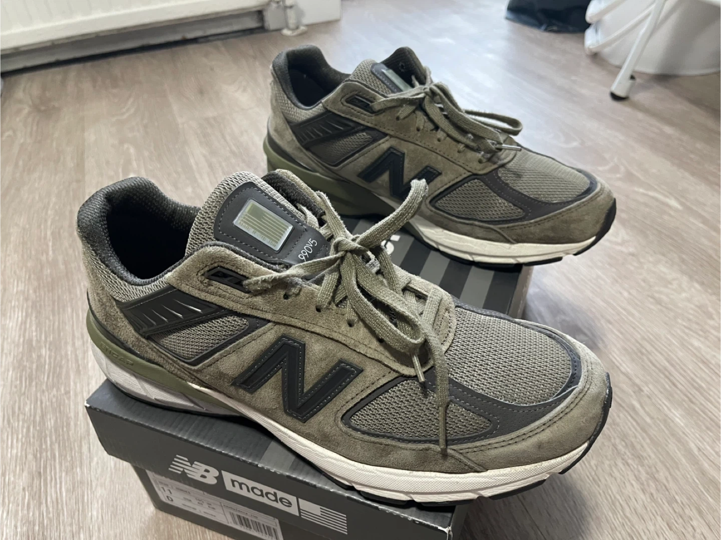 These are New Balance 990v5 sneakers, made in the USA. They feature a classic olive green colourway. The sneakers have a mesh and suede construction with ENCAP midsole technology. These shoes are great for everyday wear!