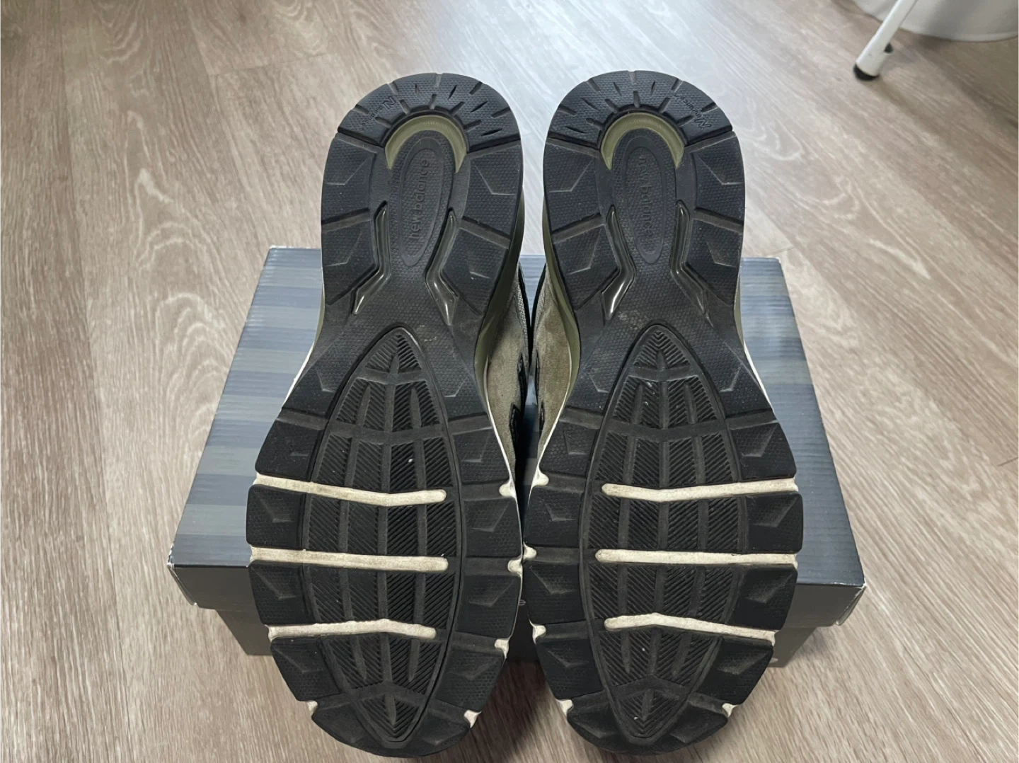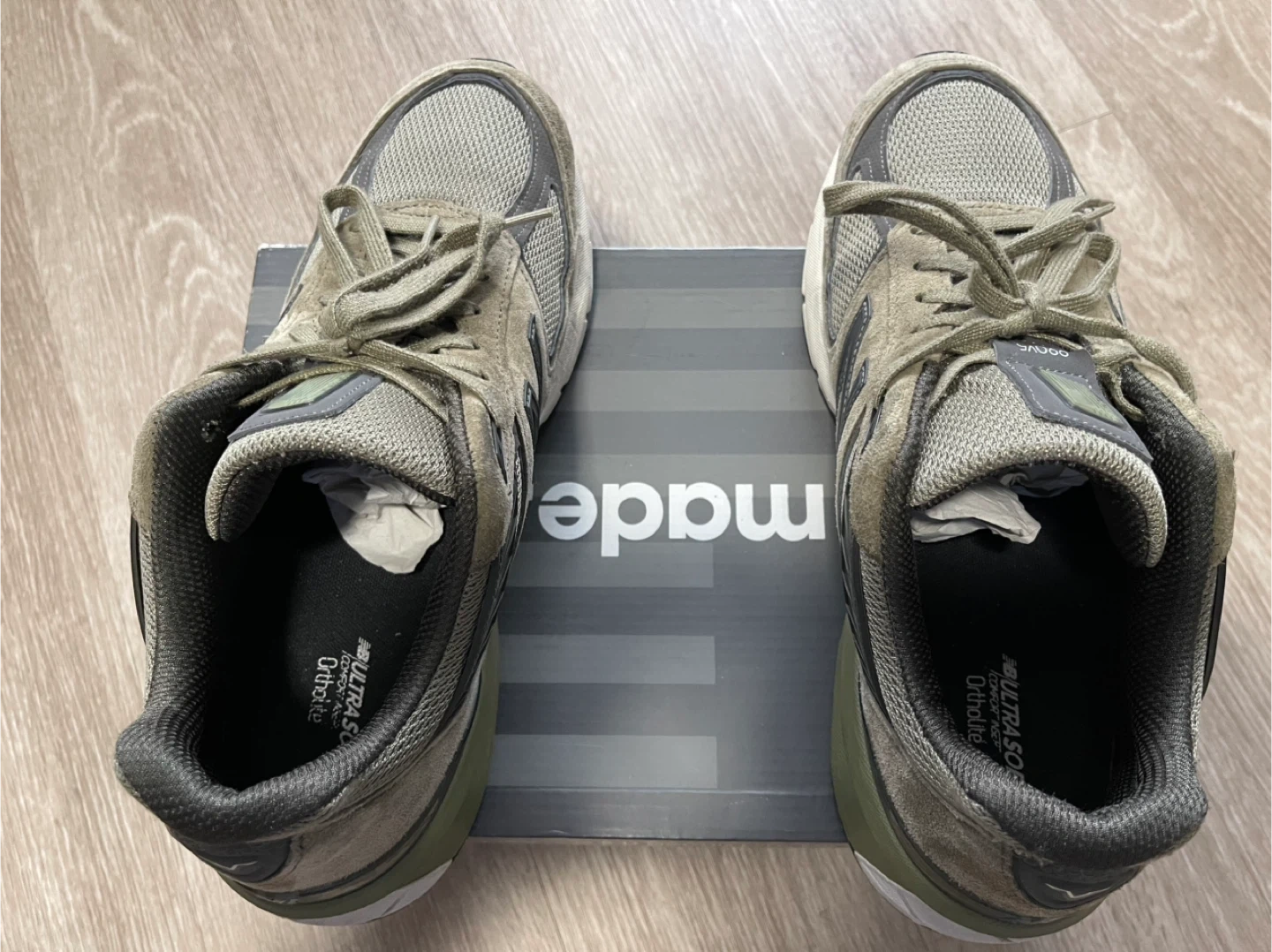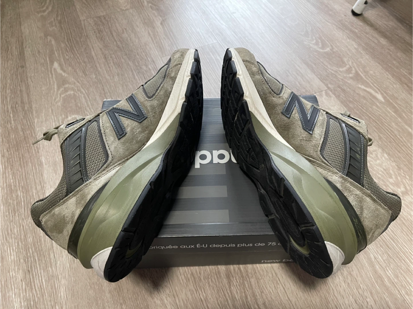 These are New Balance 990v5 sneakers, made in the USA. They feature a classic olive green colourway. The sneakers have a mesh and suede construction with ENCAP midsole technology. These shoes are great for everyday wear!