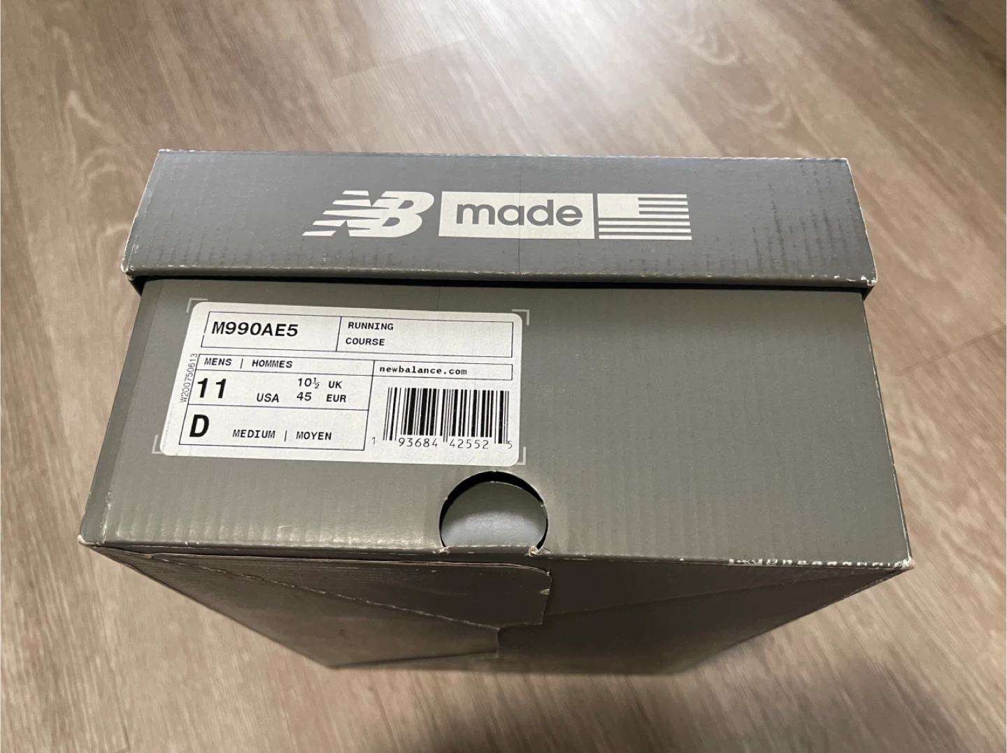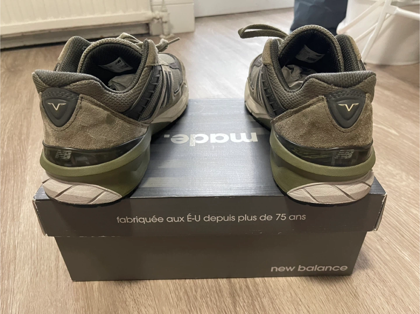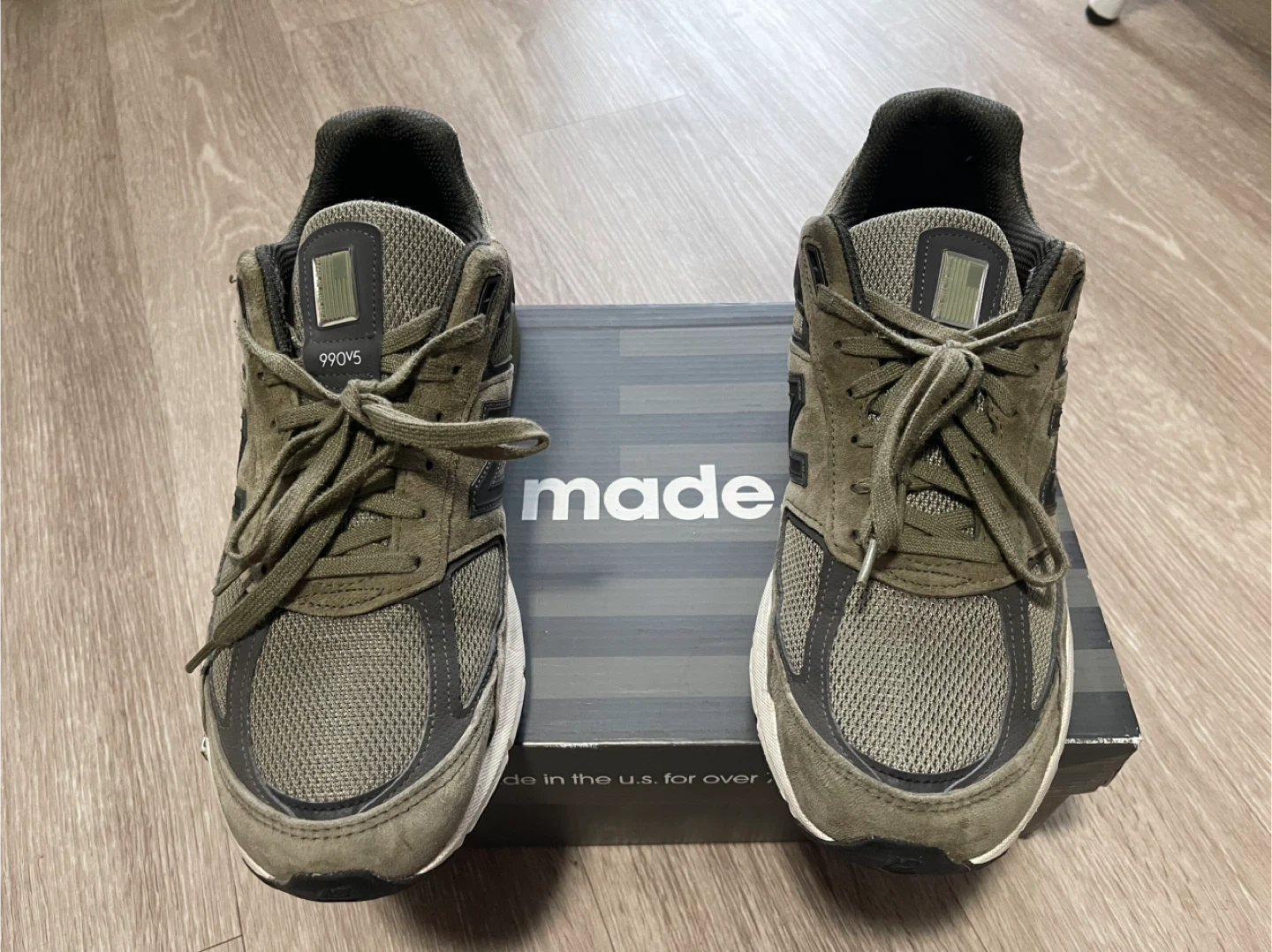 These are New Balance 990v5 sneakers, made in the USA. They feature a classic olive green colourway. The sneakers have a mesh and suede construction with ENCAP midsole technology. These shoes are great for everyday wear!