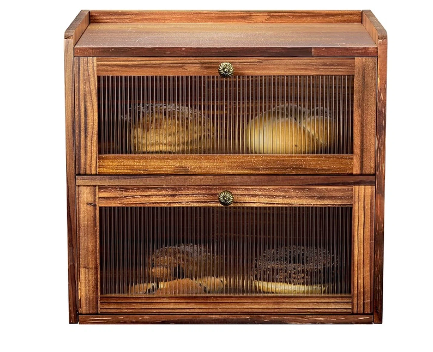 Wooden Bread Box for Kitchen Countertop Large Bread Storage Container Bin, 2 Layer Breadbox for Homemade Bread, Vintage Farmhouse Organizer Pantry Shelf Pastry Display Case with Window Brown Pine Wood