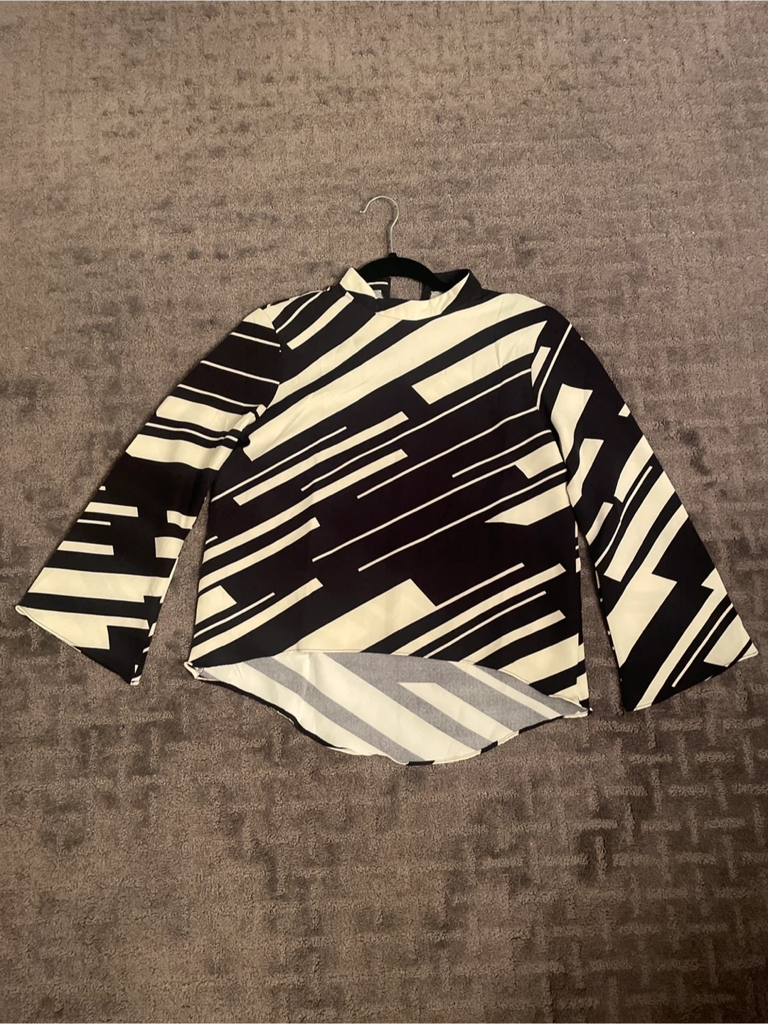 This is a stylish long-sleeve top with a unique black and white geometric pattern. It features a quarter-zip neckline and a high-low hem. The material feels smooth and lightweight, perfect for layering or wearing on its own. It's in great condition and ready for a new home size small