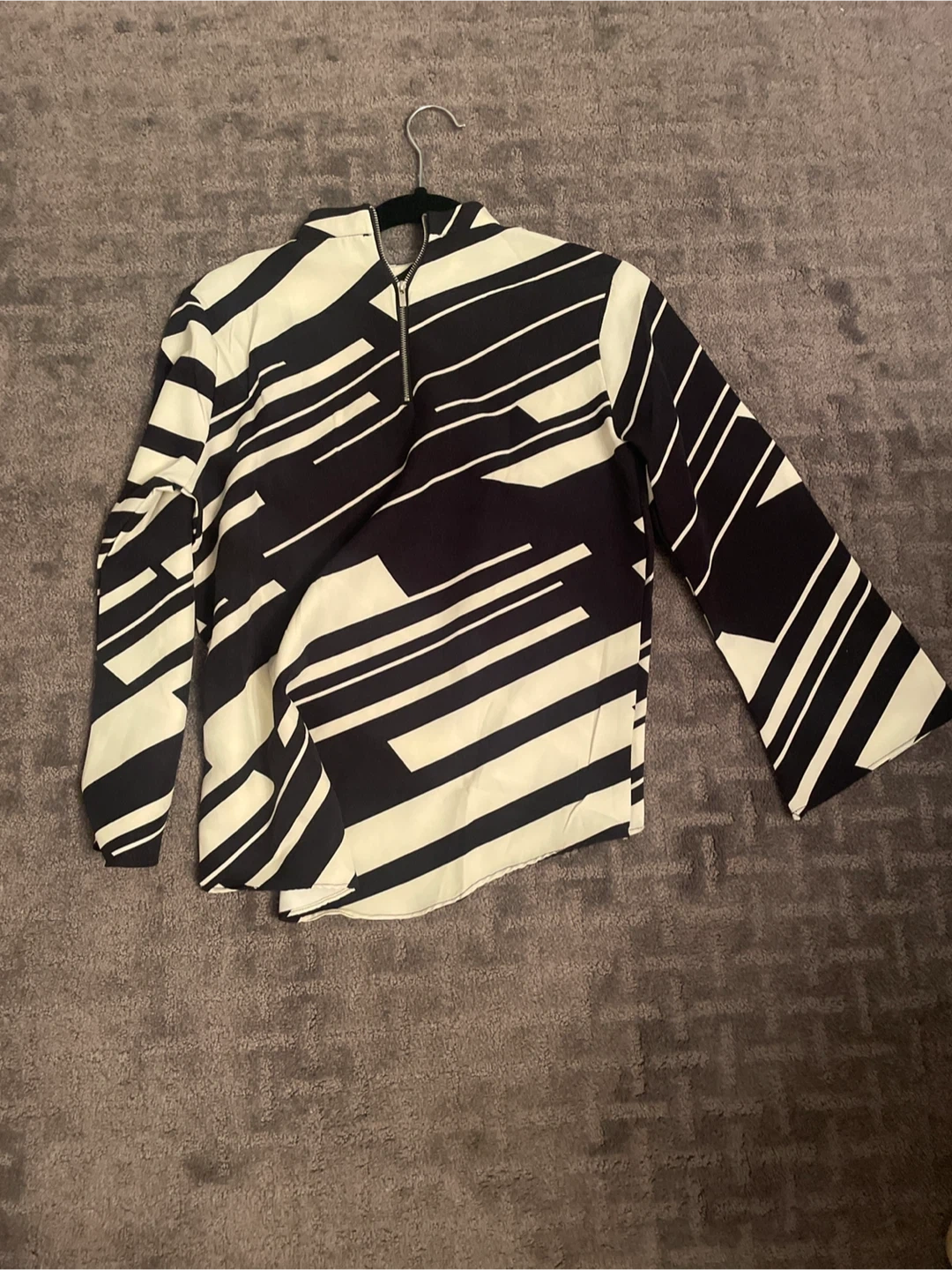 This is a stylish long-sleeve top with a unique black and white geometric pattern. It features a quarter-zip neckline and a high-low hem. The material feels smooth and lightweight, perfect for layering or wearing on its own. It's in great condition and ready for a new home size small