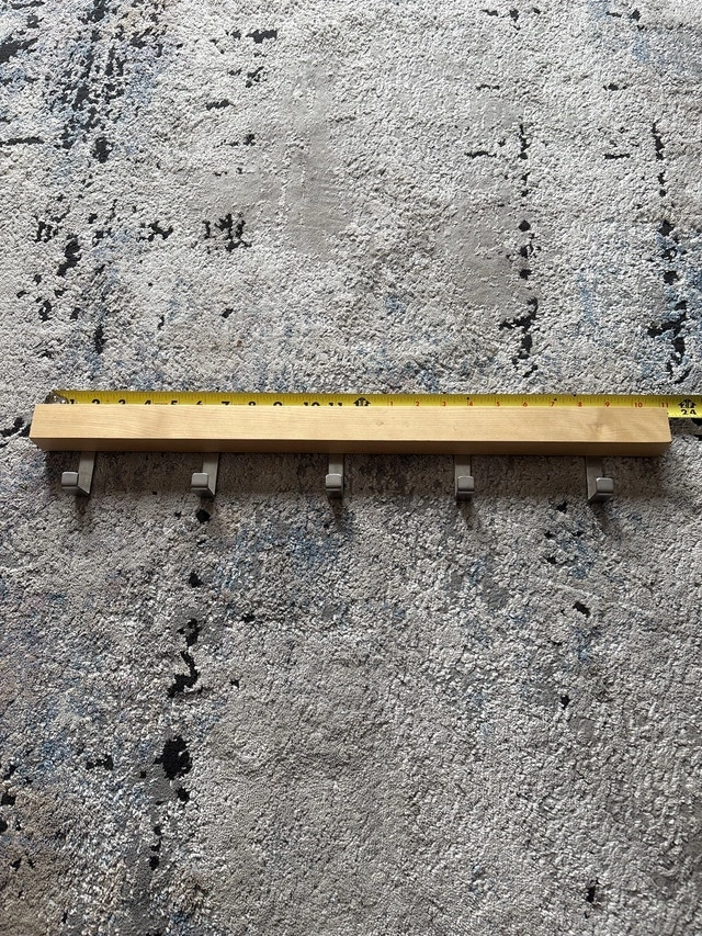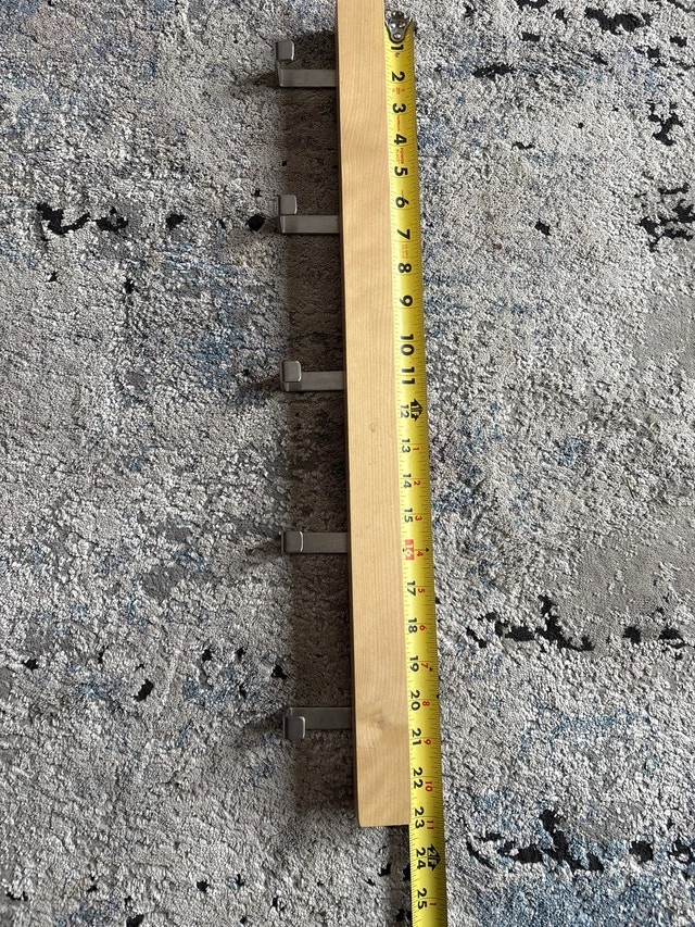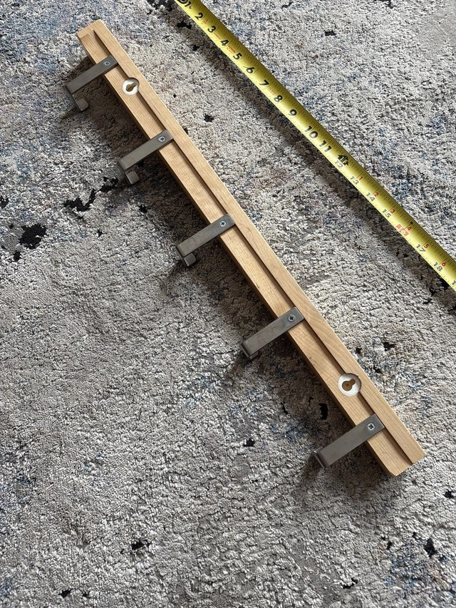This wooden wall mount coat hanger is perfect for adding a touch of rustic charm and organization to your space. This coat rack features six sturdy, metal hooks, ideal for coats, hats, or bags. It is in used condition. Material: Wood and Metal. Length: 23 inches. Number of Hooks: 5. Add a touch of whimsy to your decor with this coat hanger – it's not just functional, it's a conversation starter! If the ad is up, it's available!