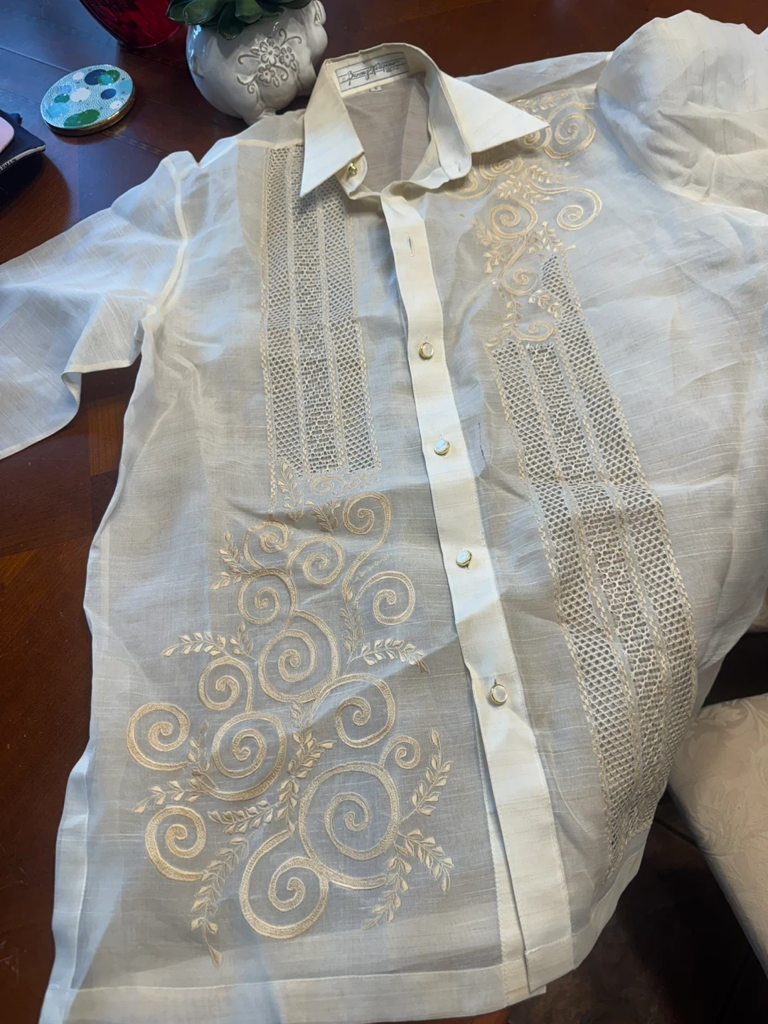 A white Barong Tagalog shirt with intricate embroidery. It's made from lightweight fabric, perfect for warm weather events. This traditional Filipino shirt features detailed swirling patterns and vertical textured panels.size small