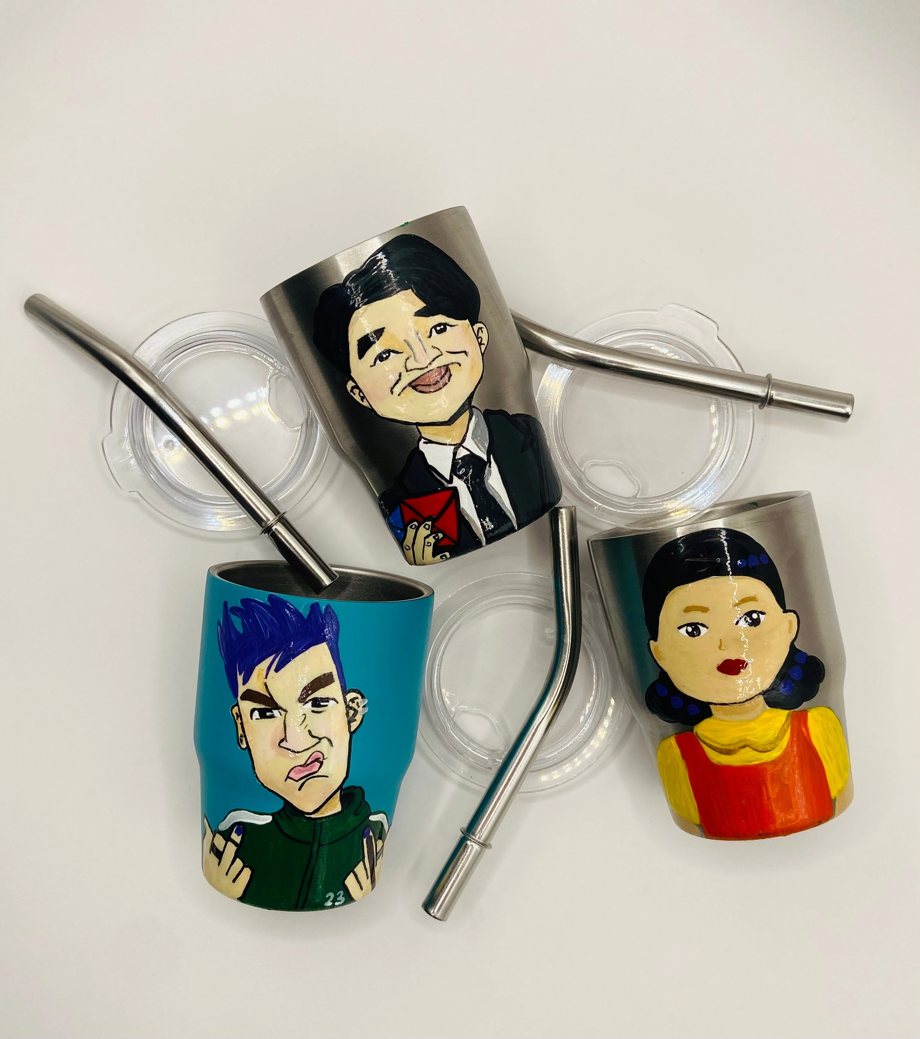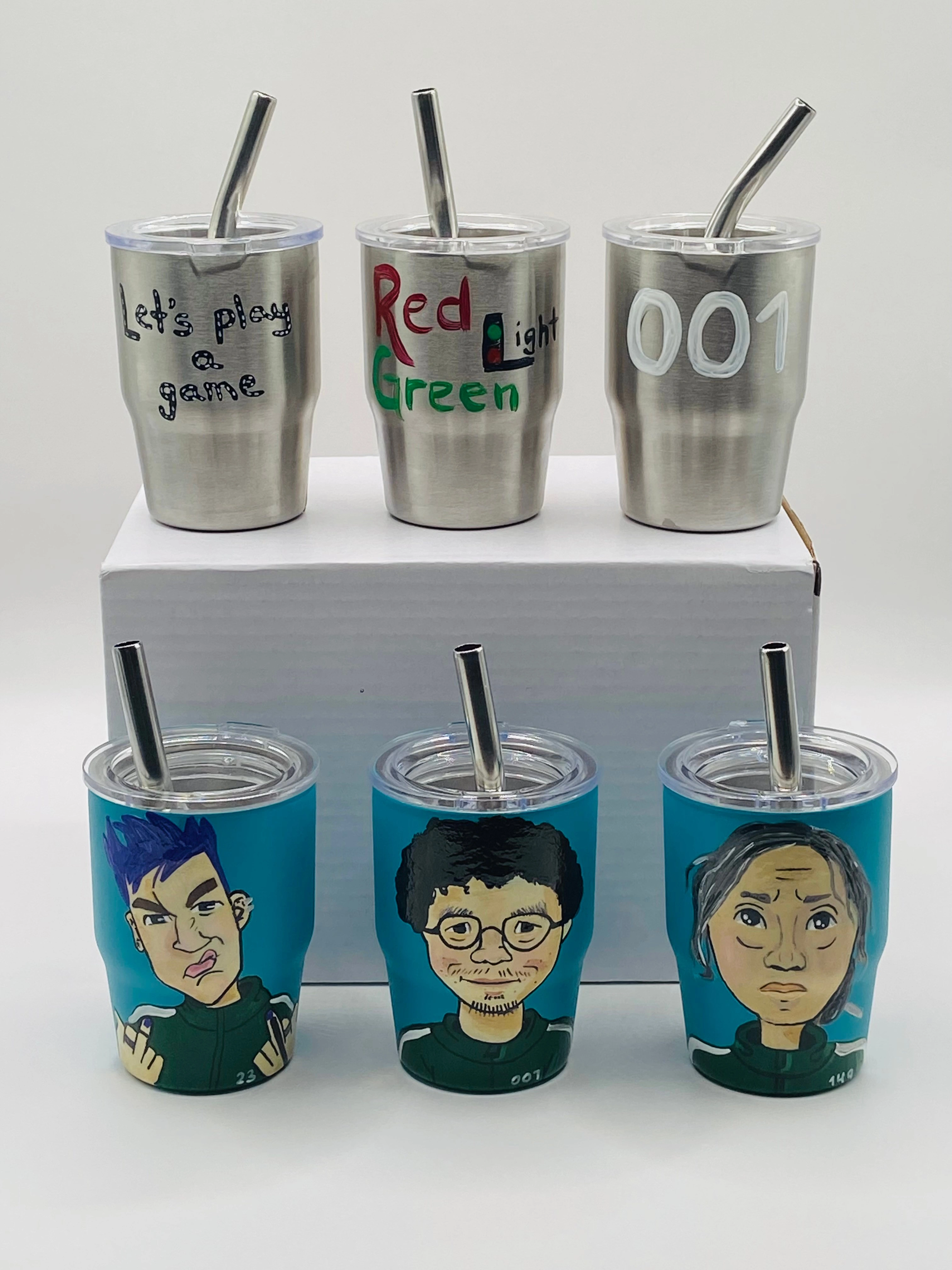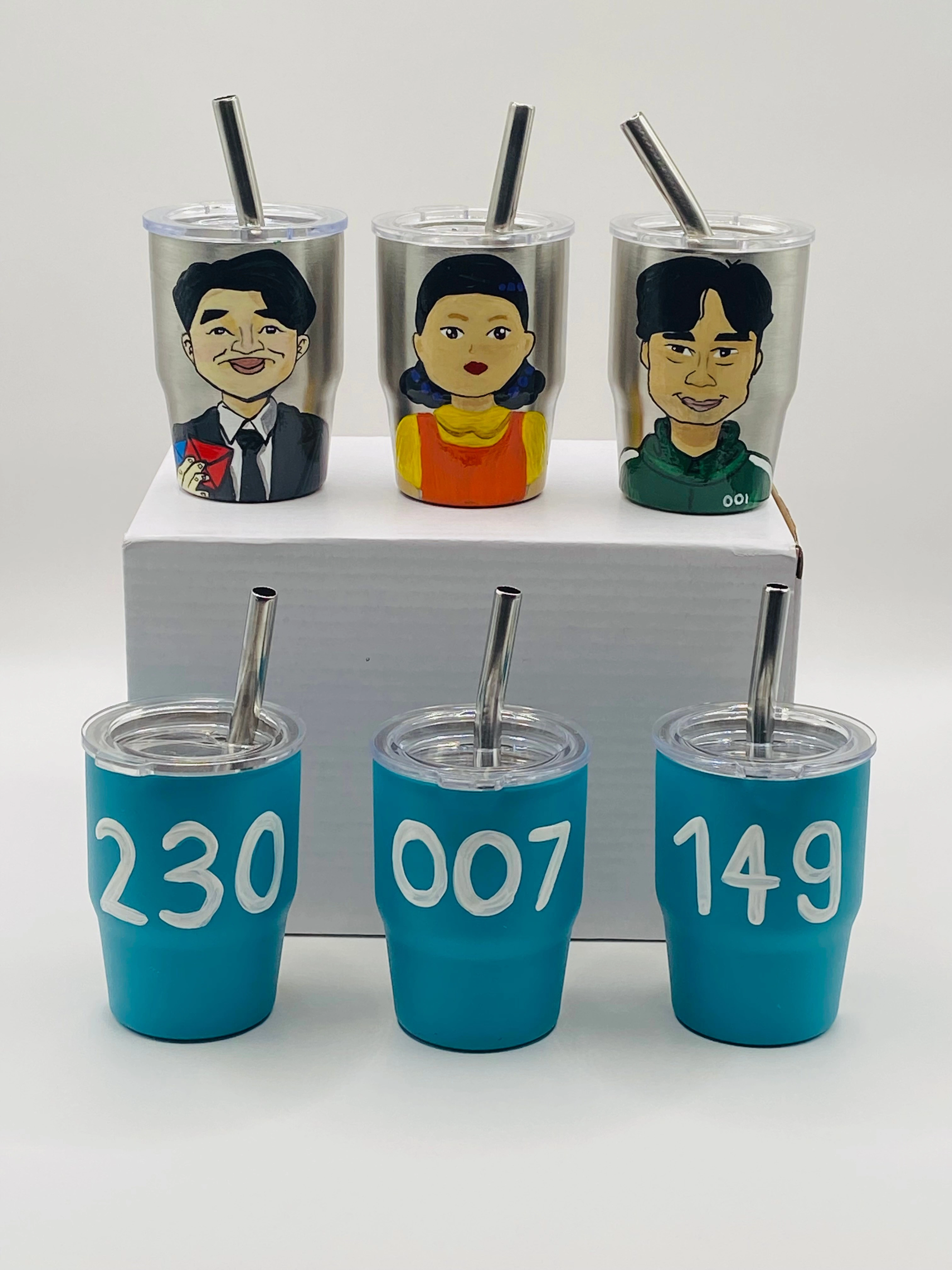 I'm selling these hand-painted mini tumblers featuring characters from Squid Game! They each come with a lid and straw. Great for any fan of the show!