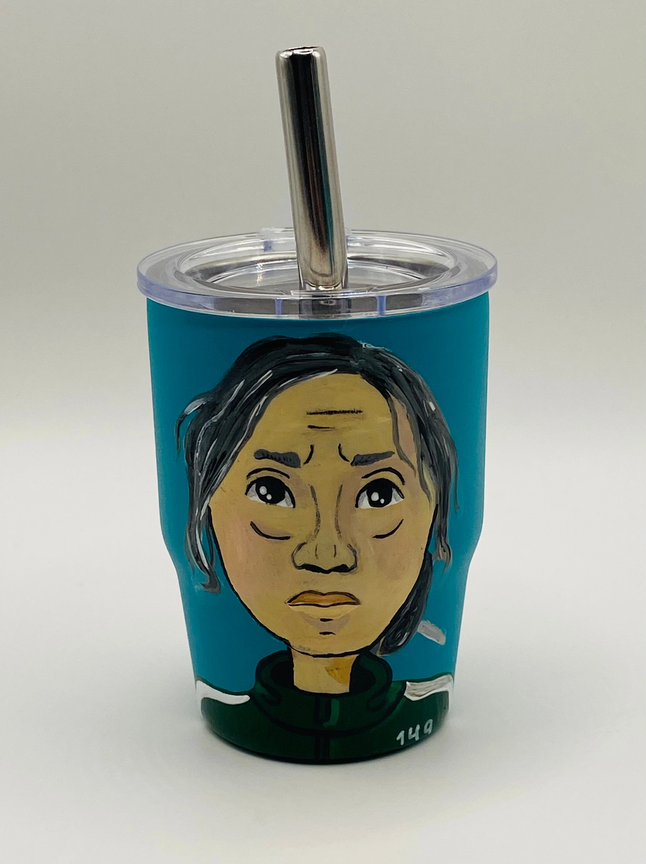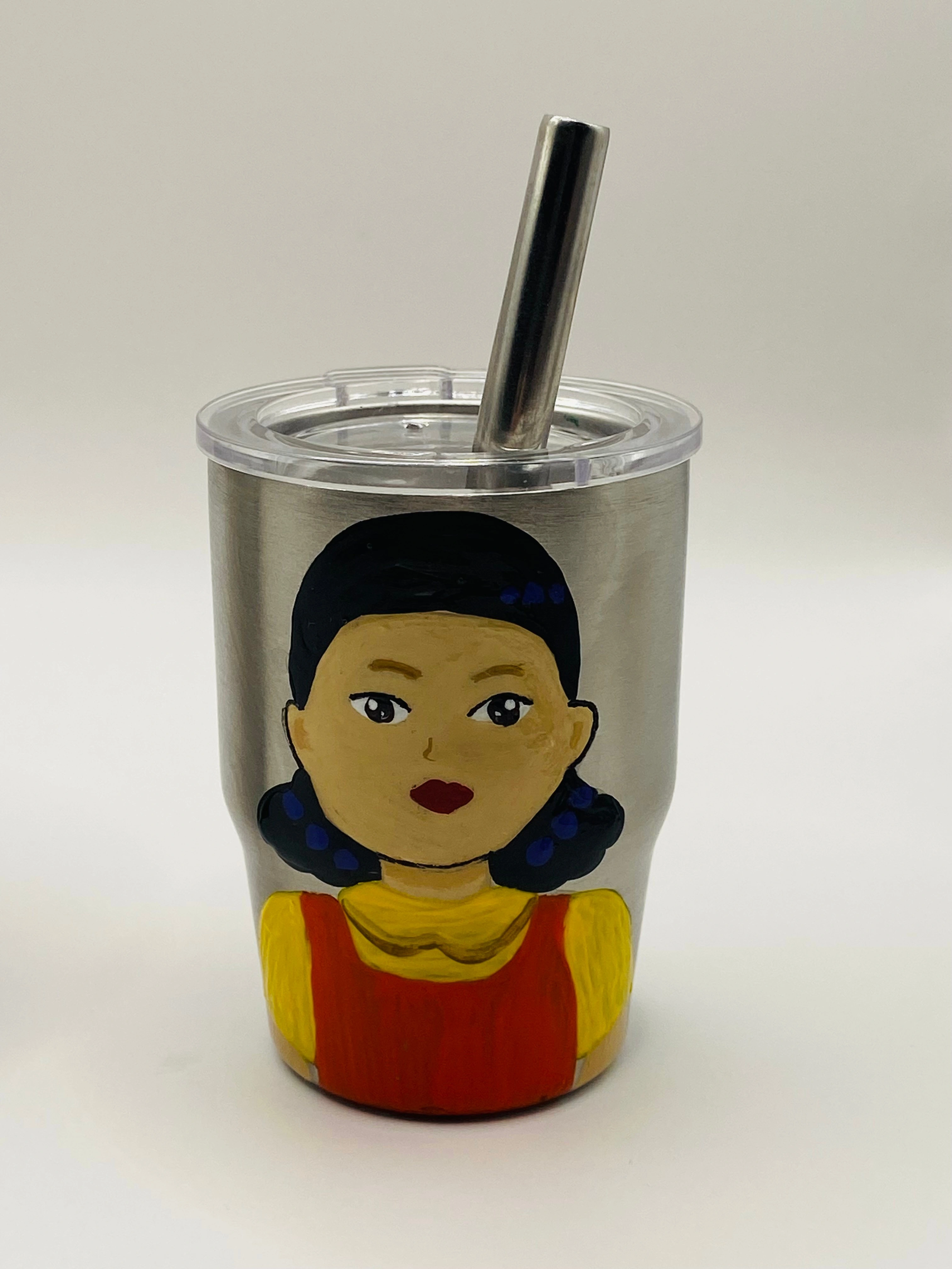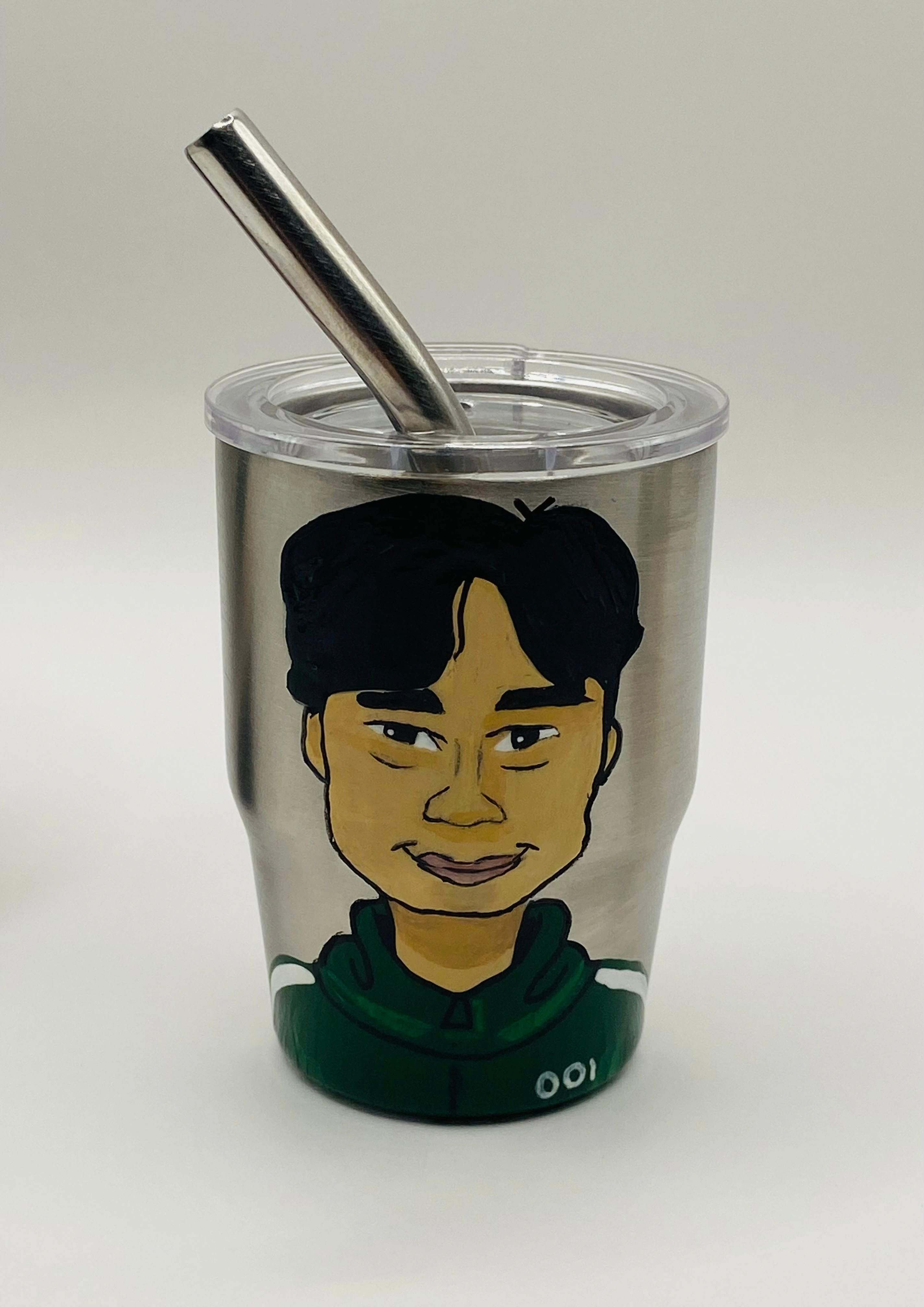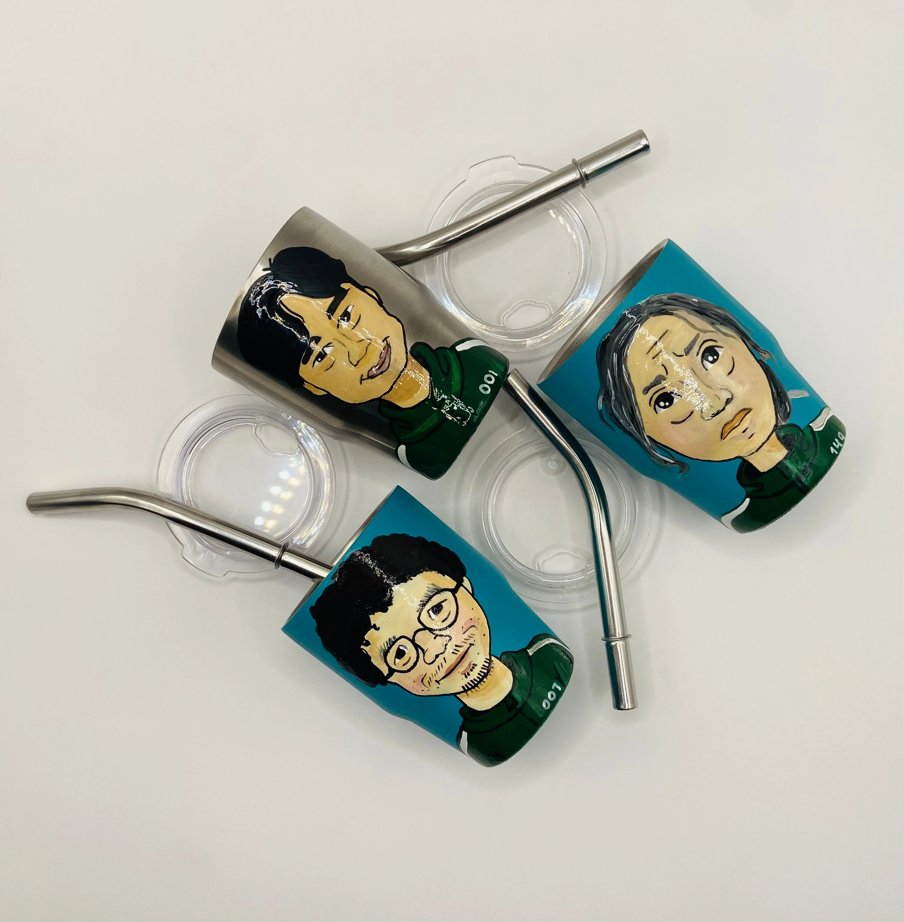 I'm selling these hand-painted mini tumblers featuring characters from Squid Game! They each come with a lid and straw. Great for any fan of the show!