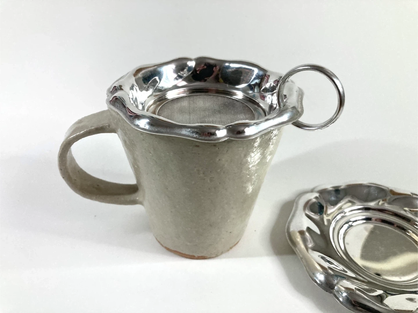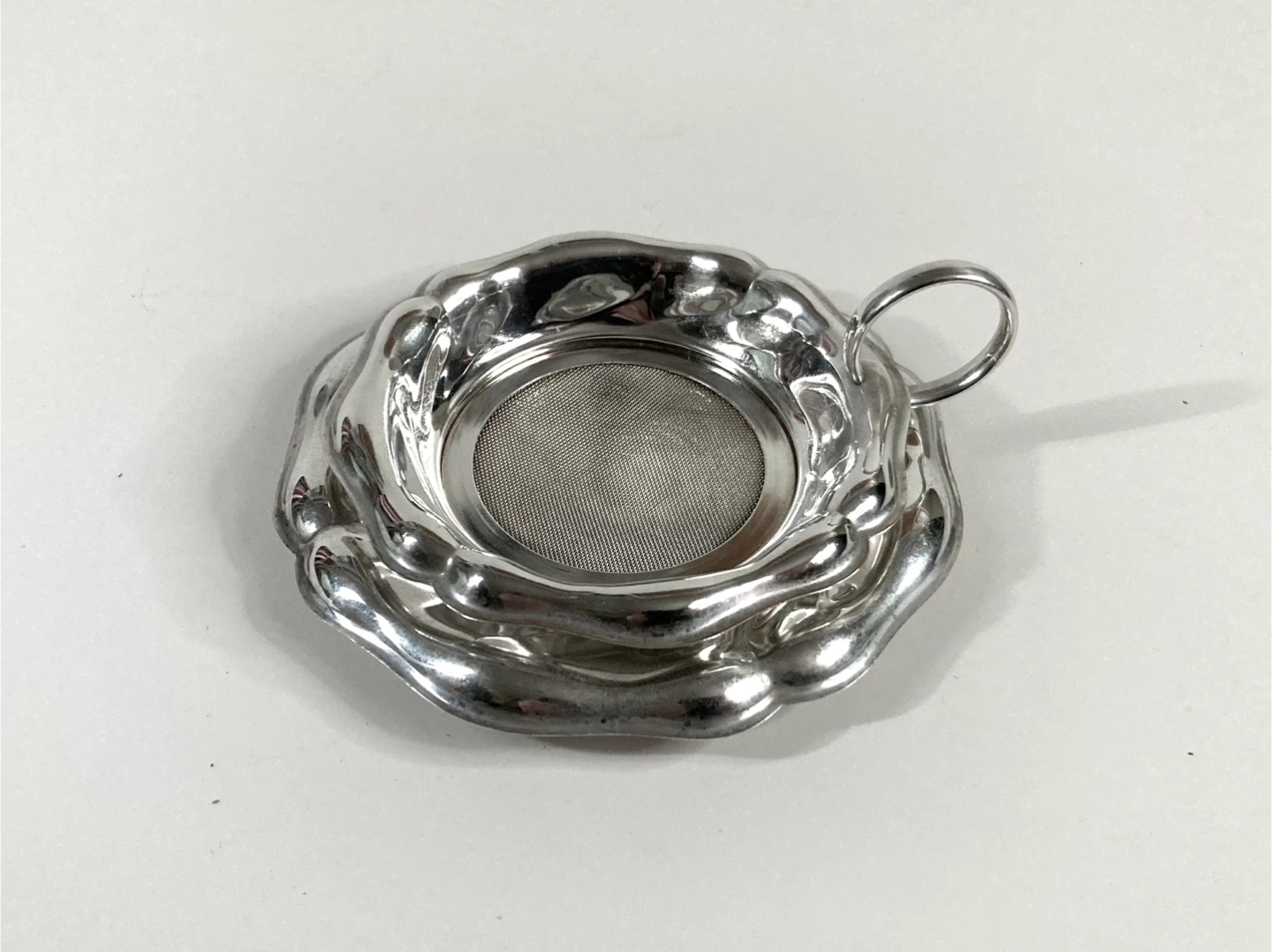 Vintage silver-plated loose leaf tea strainer with a scalloped floral rim and a matching tray. Unmarked not sure of date of origin. There is some minor wear and scuffs on the plating and slight tarnish due to previous use and age. Otherwise very good condition.