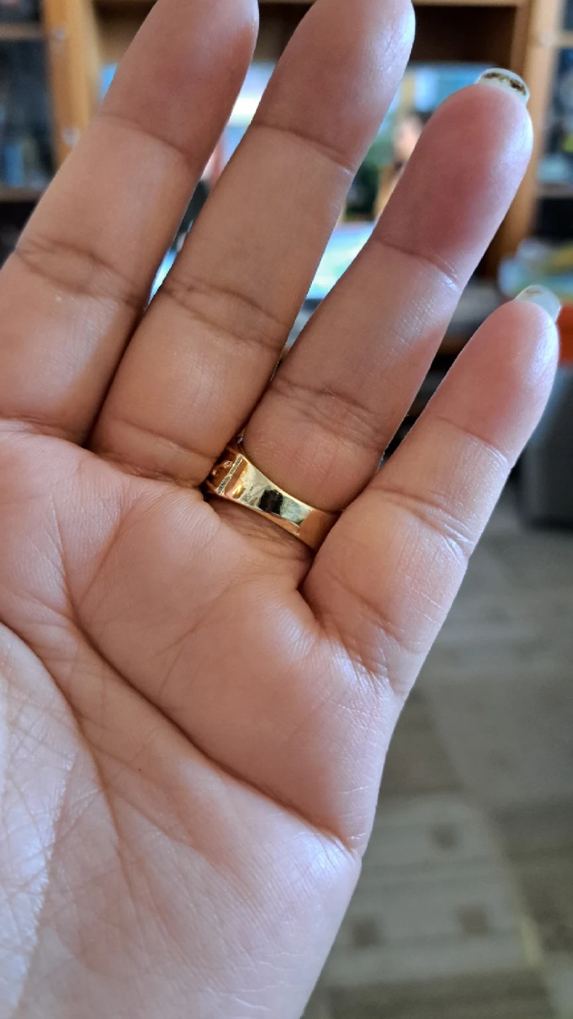 This ring features a large, rectangular red stone set in a gold-tone band. The band has a classic signet style with decorative detailing on the sides. It's a statement piece that adds a pop of colour. Suitable for occasions where you want to make an impression.