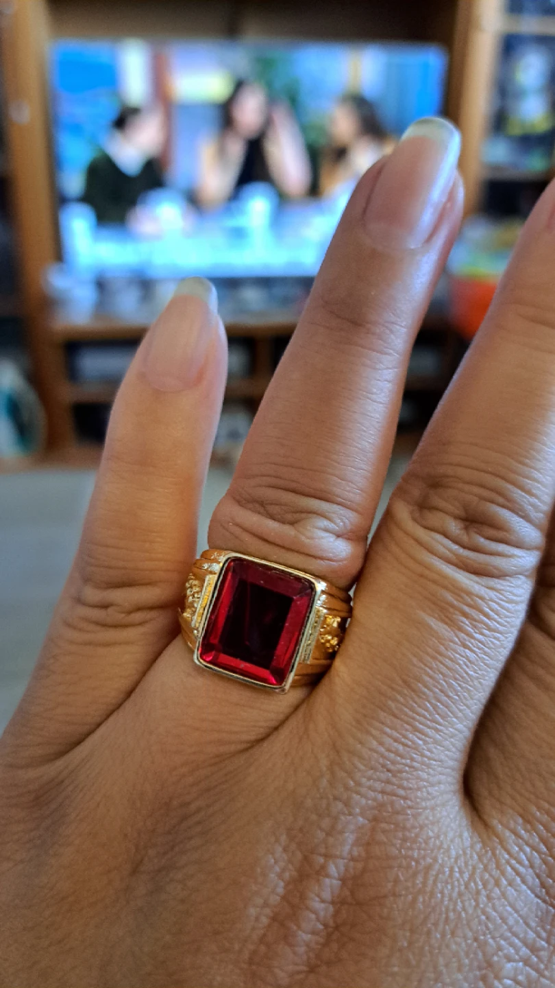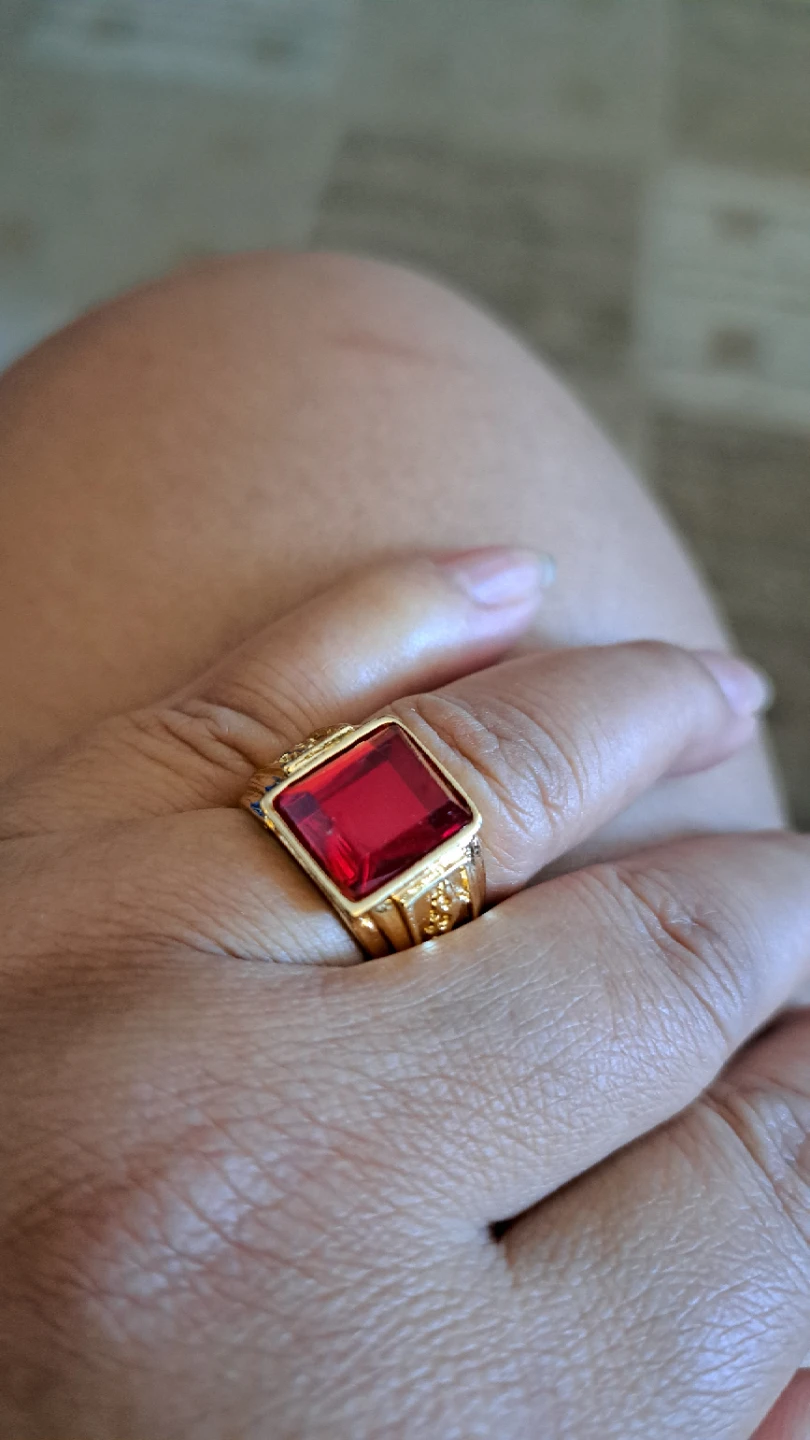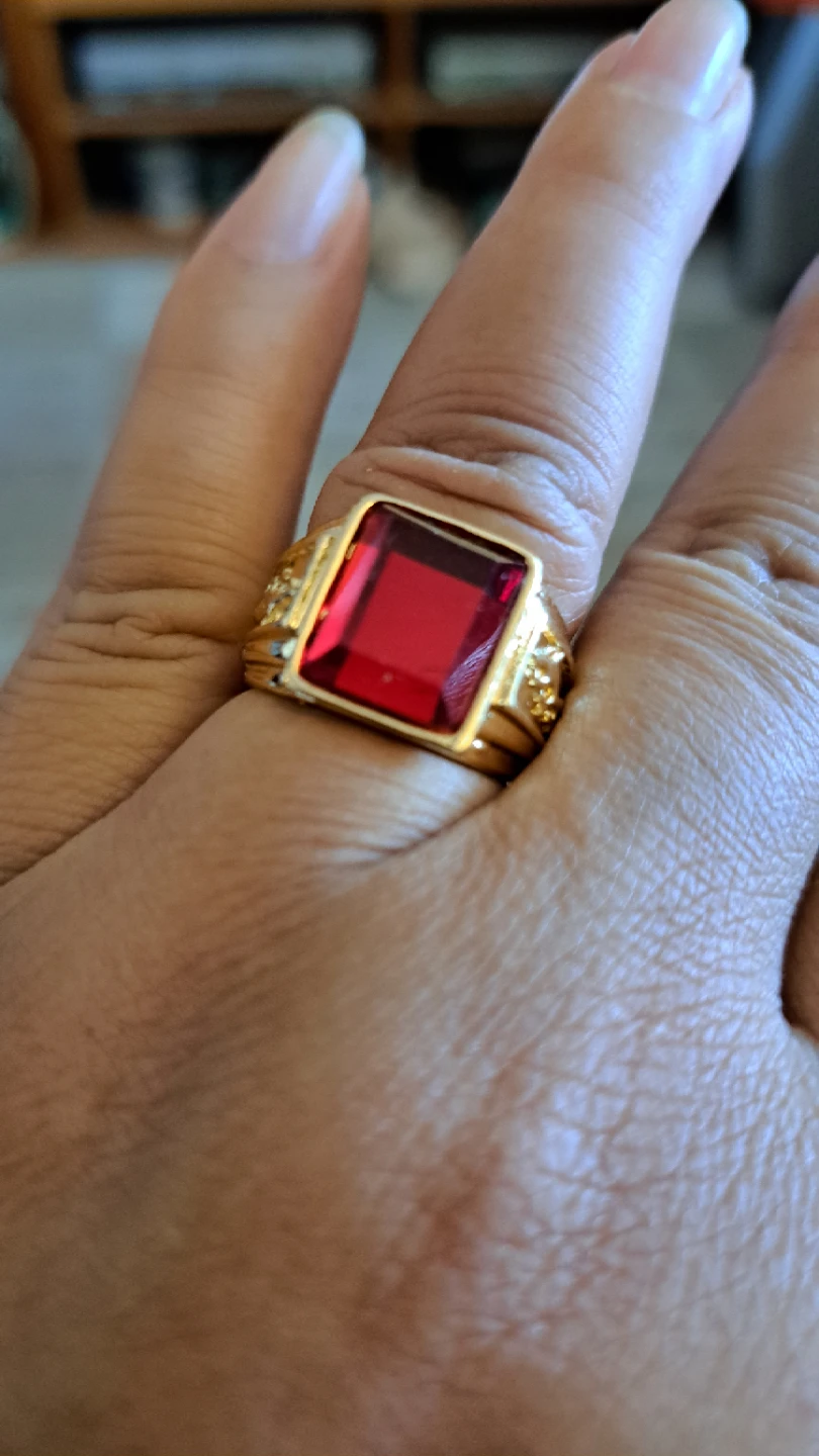 This ring features a large, rectangular red stone set in a gold-tone band. The band has a classic signet style with decorative detailing on the sides. It's a statement piece that adds a pop of colour. Suitable for occasions where you want to make an impression.