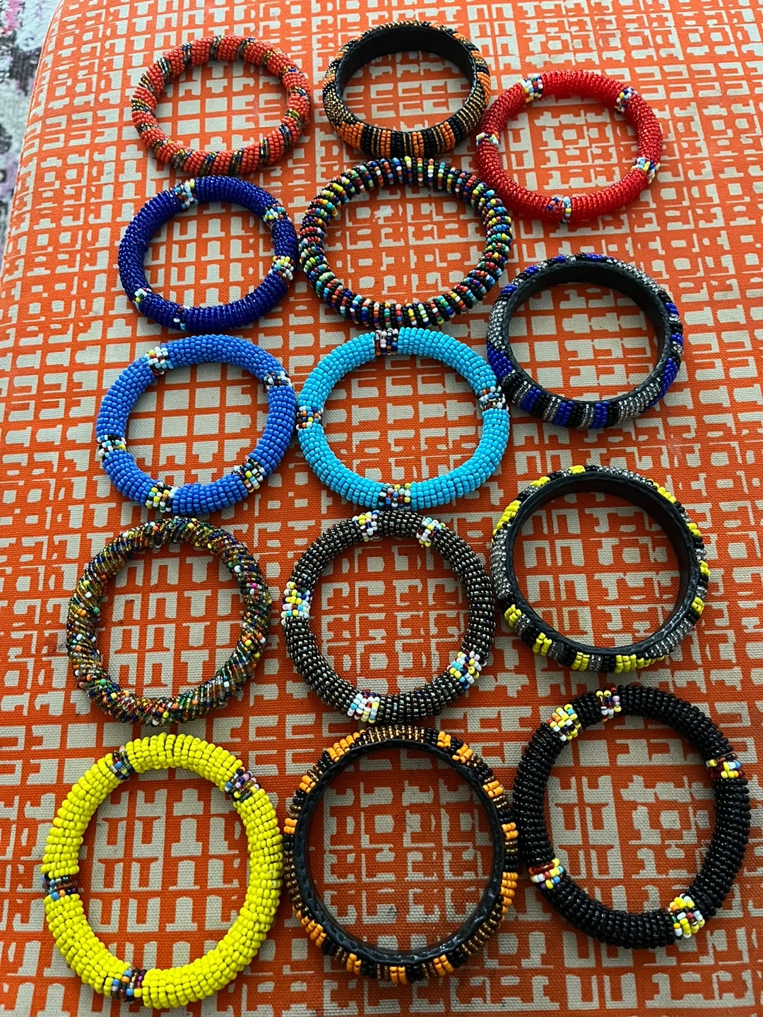 These are colourful beaded bracelets. They're handmade with small beads wrapped around a sturdy base. Great for adding a pop of colour to any outfit!