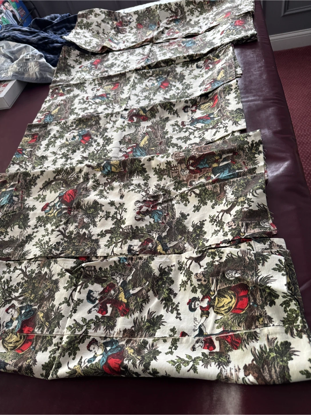 This set includes panels featuring a classic toile print with pastoral scenes. The fabric has a vintage-inspired design in red, green, and blue on a cream background. Ideal for crafting or home decor projects! Assorted sizes.