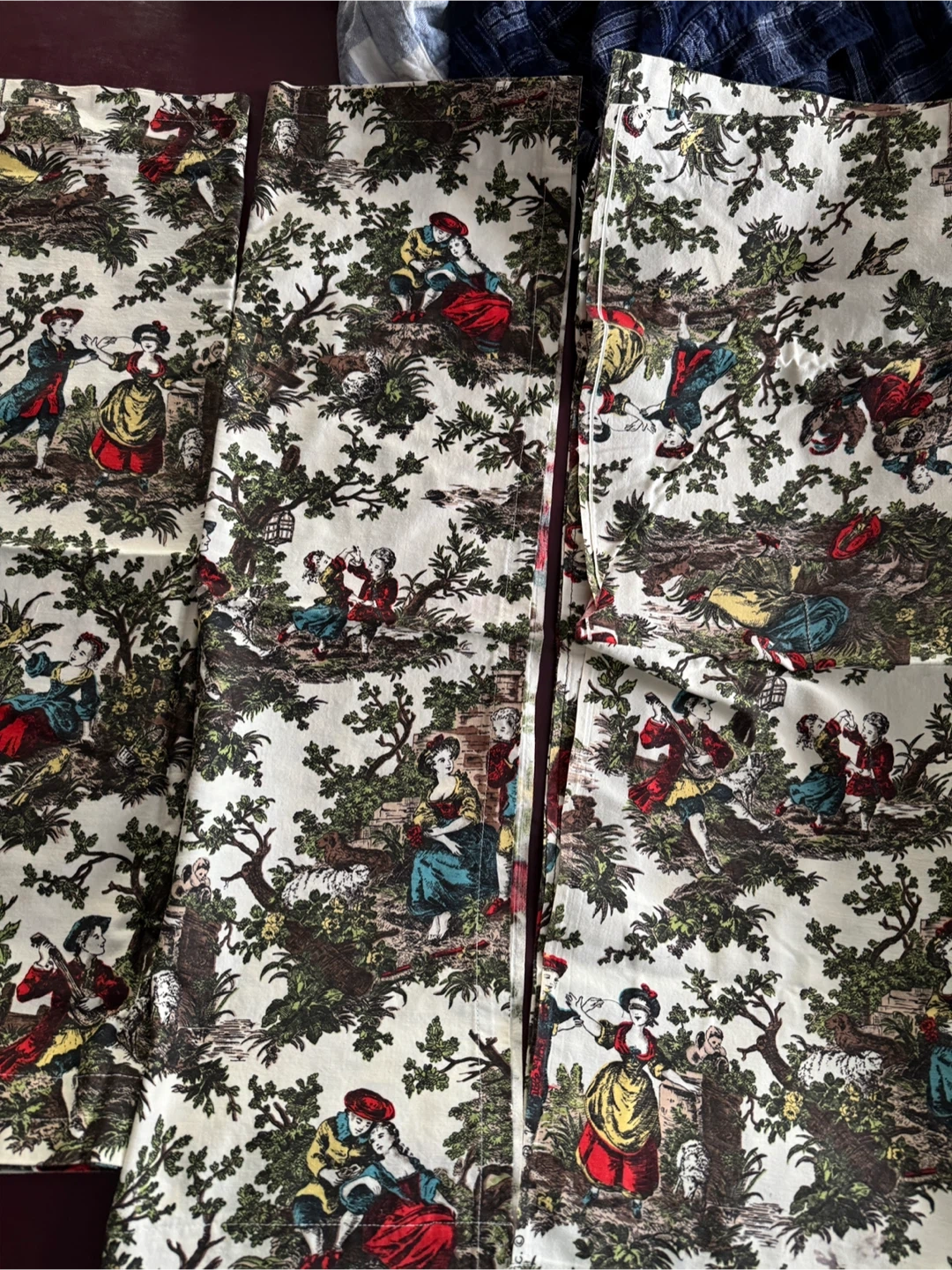 This set includes panels featuring a classic toile print with pastoral scenes. The fabric has a vintage-inspired design in red, green, and blue on a cream background. Ideal for crafting or home decor projects! Assorted sizes.
